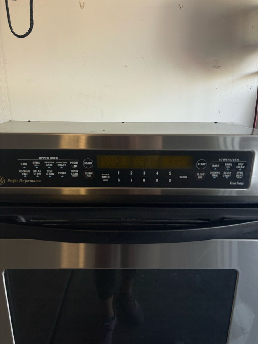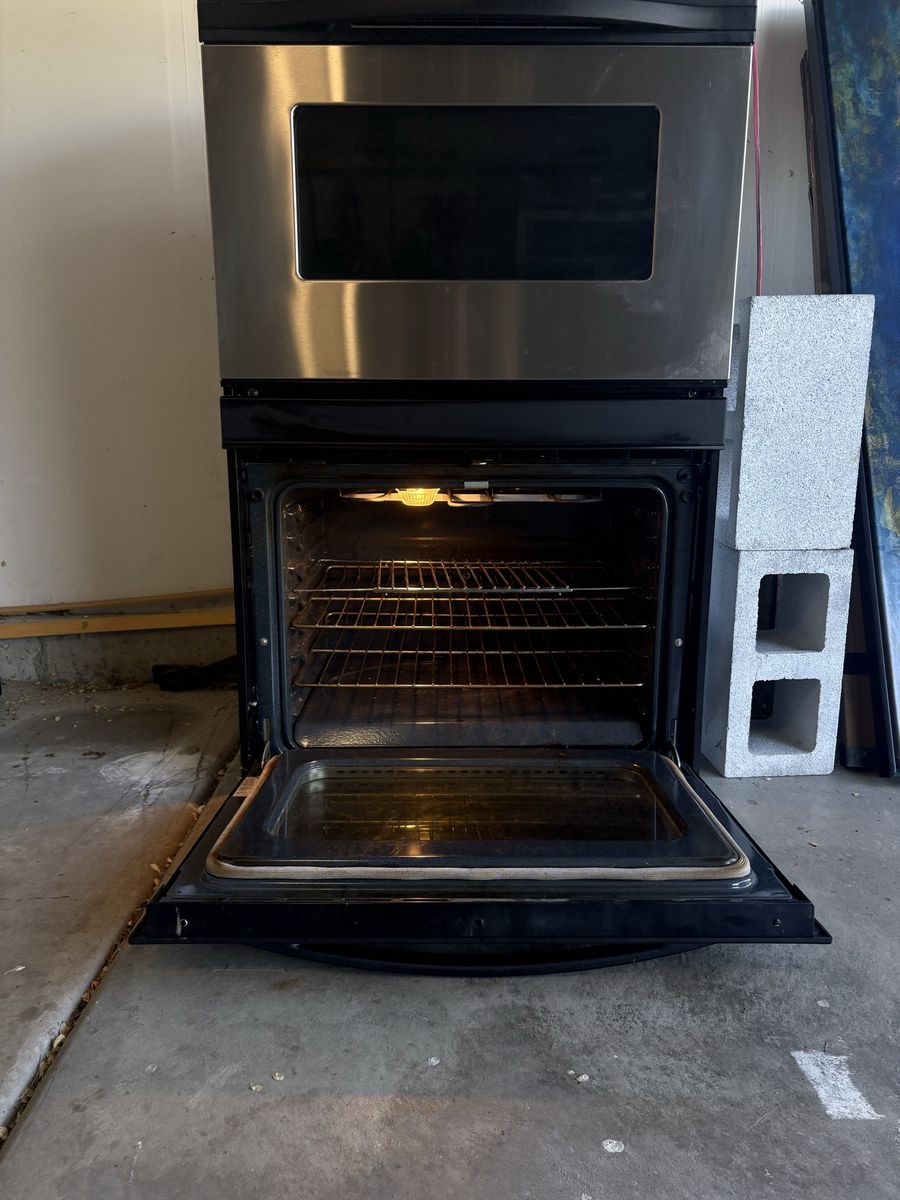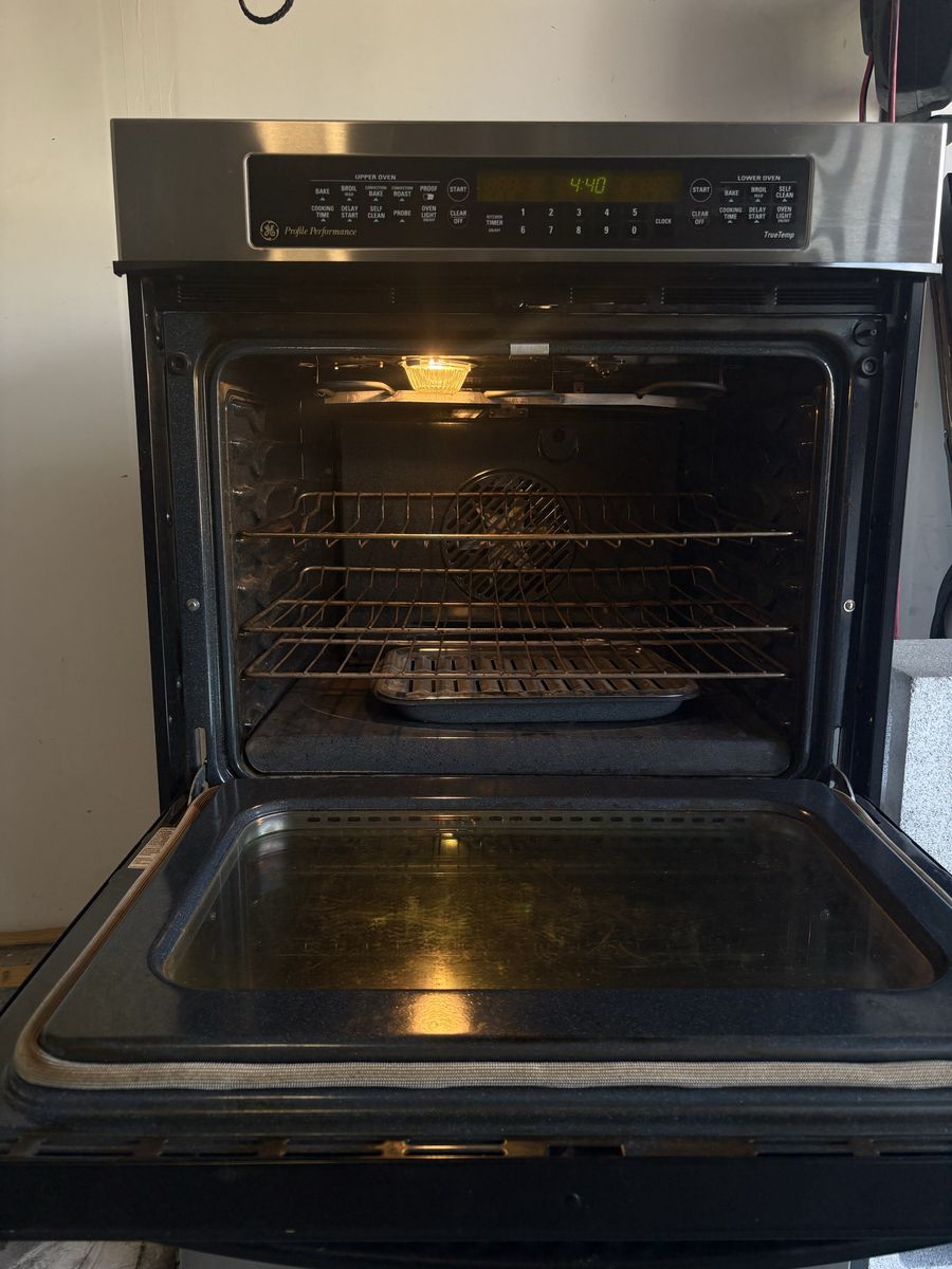 VenmoDouble electric oven. GE profile performance. The outside face of the oven is 29.5”. It is 52” tall and 24” deep. The inside measures 23.5”x16”. Unsure on age. The previous people we bought it from said they bought it new. And we have had it for not quite a year. Everything works great, just upgraded to a different style. The top oven can do convection bake/roast or normal.