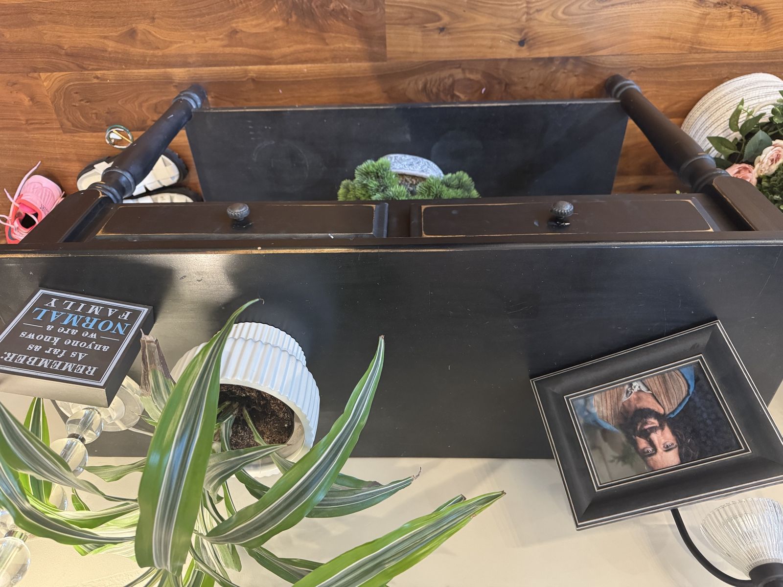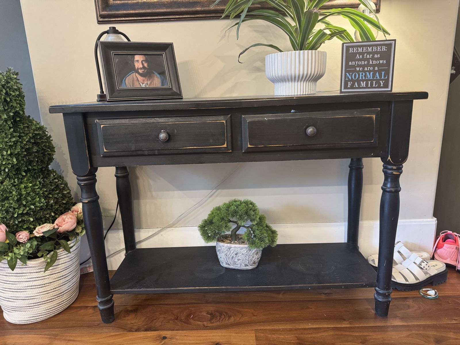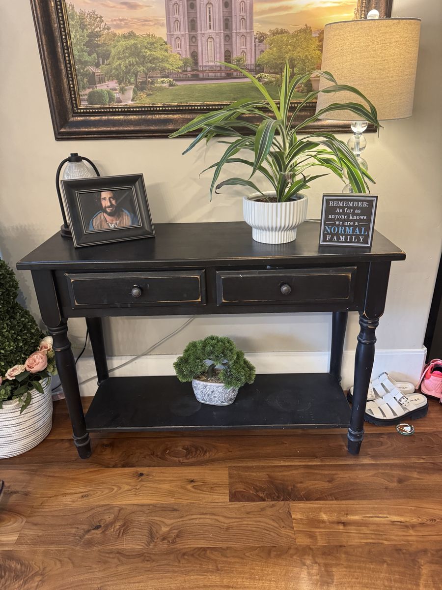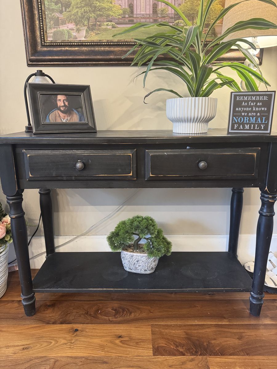 entry way table, distressed black color. in great condition, 2 drawers. It is 44 inches wide (side to side), 31 inches tall, and 16 1/2 inches deep. pick up in Holladay!