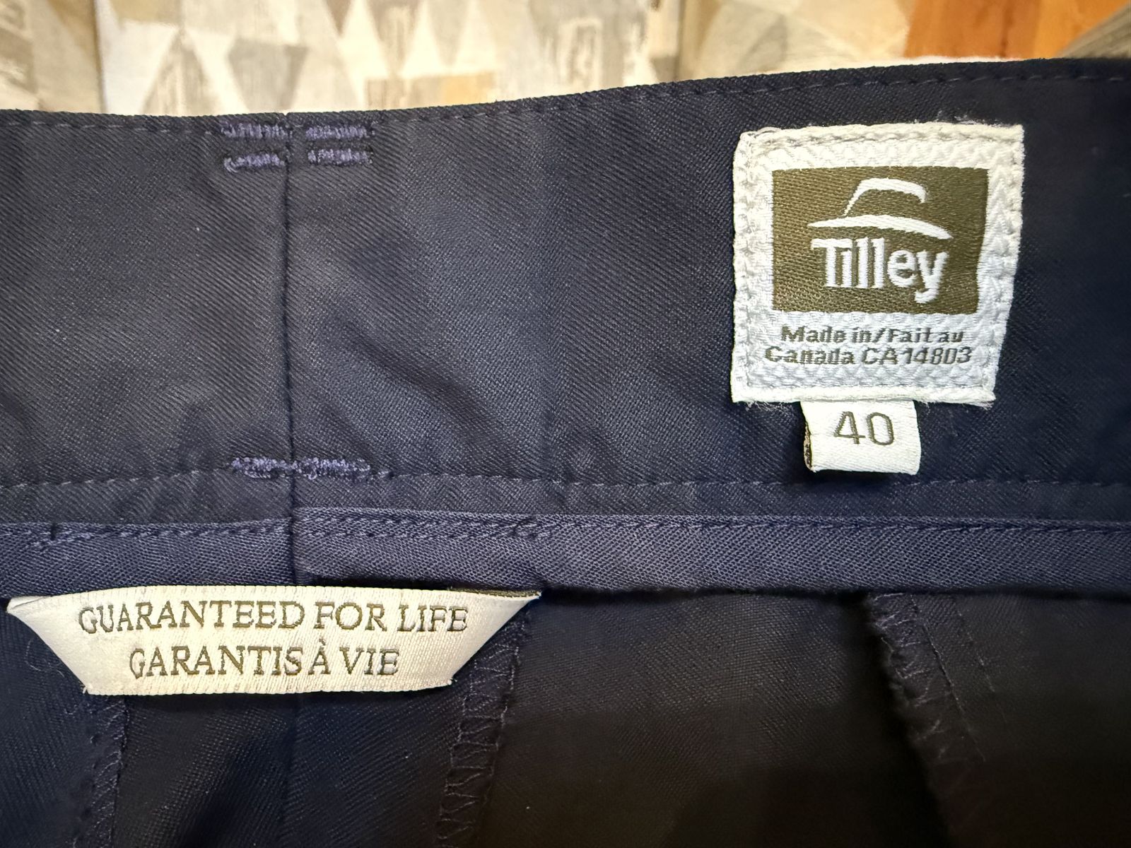 ZelleThe Tilley Endurables men's Travel Pant in dark blue is a versatile and durable option for those who are looking for a comfortable and practical travel pant. Made in Canada, this pant features a zip closure, adjustable waist, and deep pockets for added convenience. The mid-rise and straight leg fit, along with moisture-wicking and quick-dry properties, make it an ideal choice for outdoor and travel activities in the warmer months. Easy to care for with its machine-washable nylon material, this pant combines vintage style with modern functionality for a reliable travel companion. The pants are covered by a lifetime manufacturers warranty (check with Tilley).