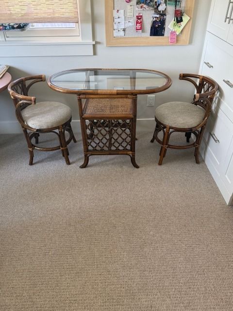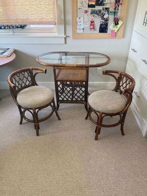 This vintage 3-piece bamboo and rattan honeymoon bisto set includes a table and two matching chairs, giving your dining area a retro 70s vibe. The set features a circular pattern and is made of rattan, wicker, and bamboo materials. The table measures 20.5 inches in length, 29.75 inches in height, and 39 inches in width. With a cotton blend upholstery fabric, this set is perfect for adults in your kitchen or dining room. Assembly is not required, making it a convenient addition to your home decor. Seat height is 20.5". Free pickup or will deliver within 50 miles of Salt Lake City $50 - within 100 miles of Salt Lake city $100.
