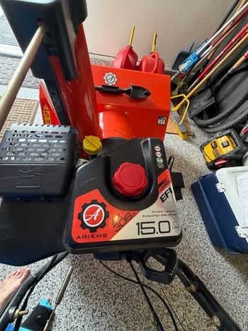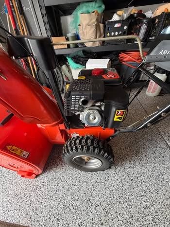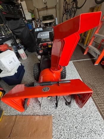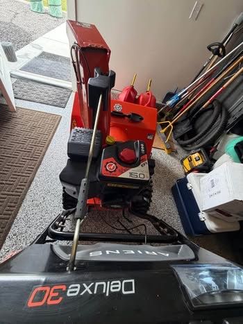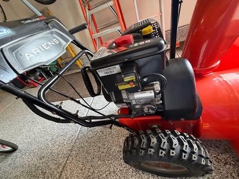 Aries Deluxe, Snow Plower, Sno-Thto, Ariens, King of Snow, width of plow 30”, EngineKey, Electric Start Button, Throttle Control Knob, Speed Selector Lever, Auger Implellor, Shear Bolt, Attachment Lever, Tractor Drive, Clutch Lever ( left Side) Forward and in reverse Dual Handle Interlock Discharge Chute Rotation Handle, Discharge, Chute Deflector Rotation handle, Discharge Chute Develtor Level, Heated Handle, Grip Switch, Scrapper Blade, Skide Blade, Skide Shoe, auto steering, Battery Charger, comes with snow blower book. Snow Blower always kept warm n garage Non Smoking Home No Pets