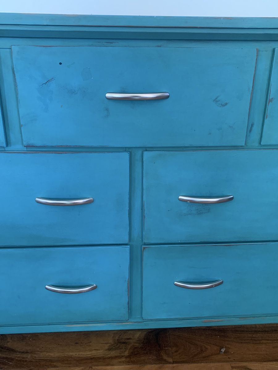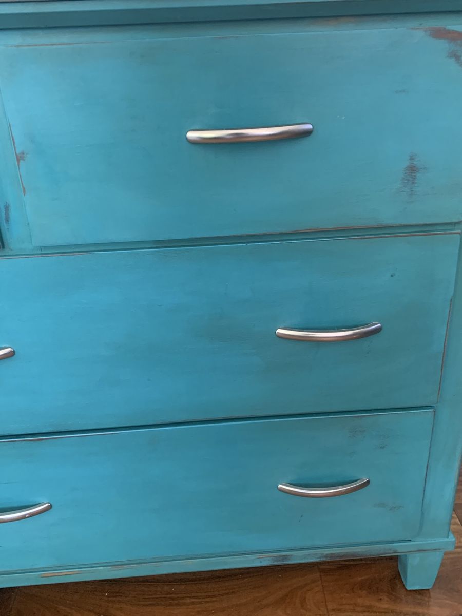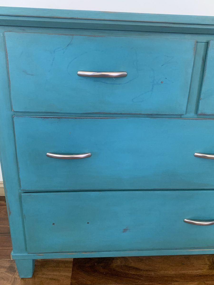 ZelleWood dresser. Some marks. Left drawer needs hardware. Left bottom drawer having problems with track but still opens and closes.