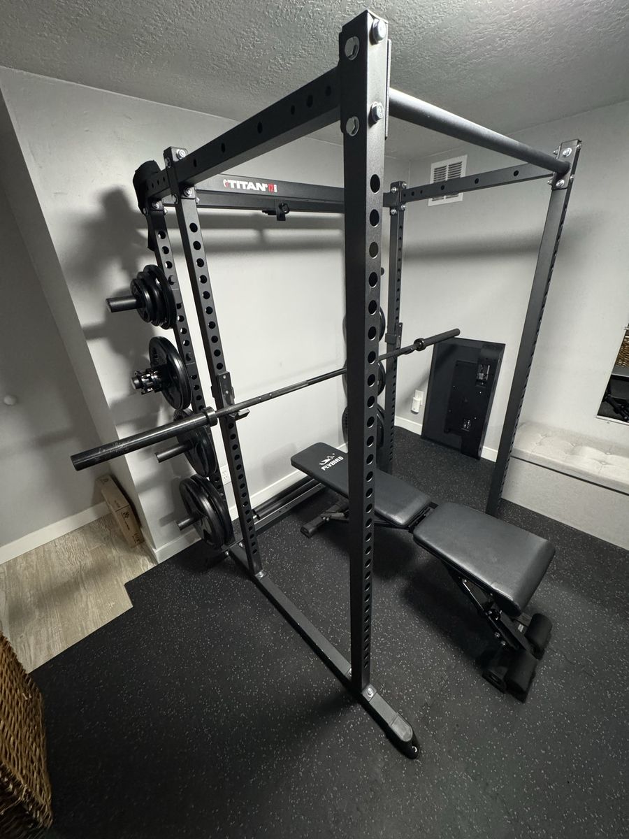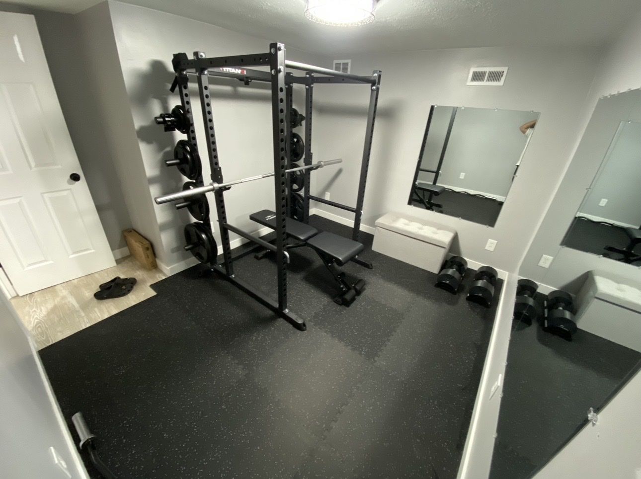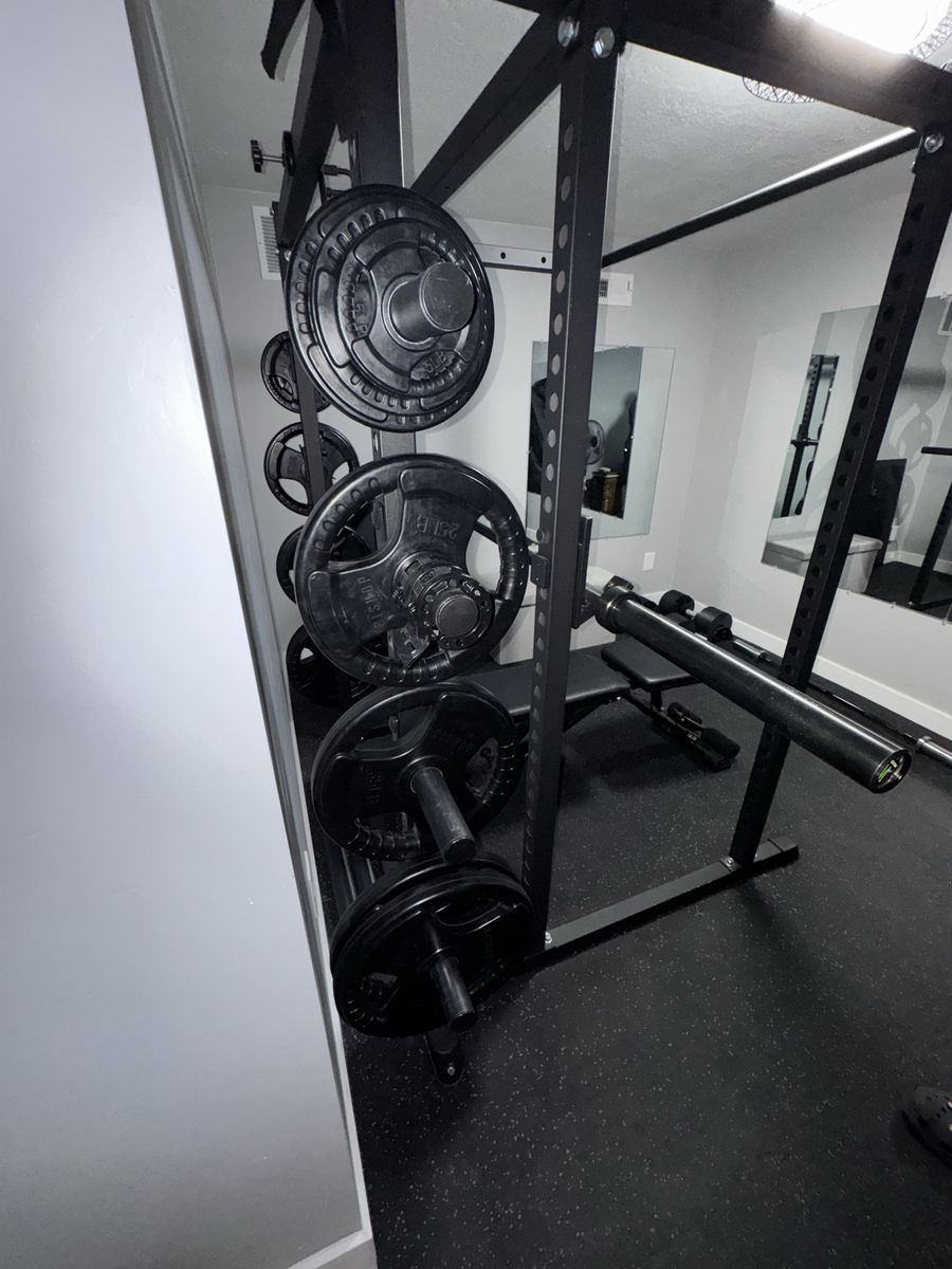 Titan T2 Squat Rack 71” Tall T-2 extension kit for plates Flybird adjustable bench 2- sleeve collars for bars 2- wrist straps 3- 36”x48” mirrors Mats included for an 8’x10’ Room