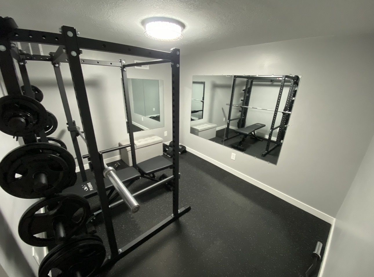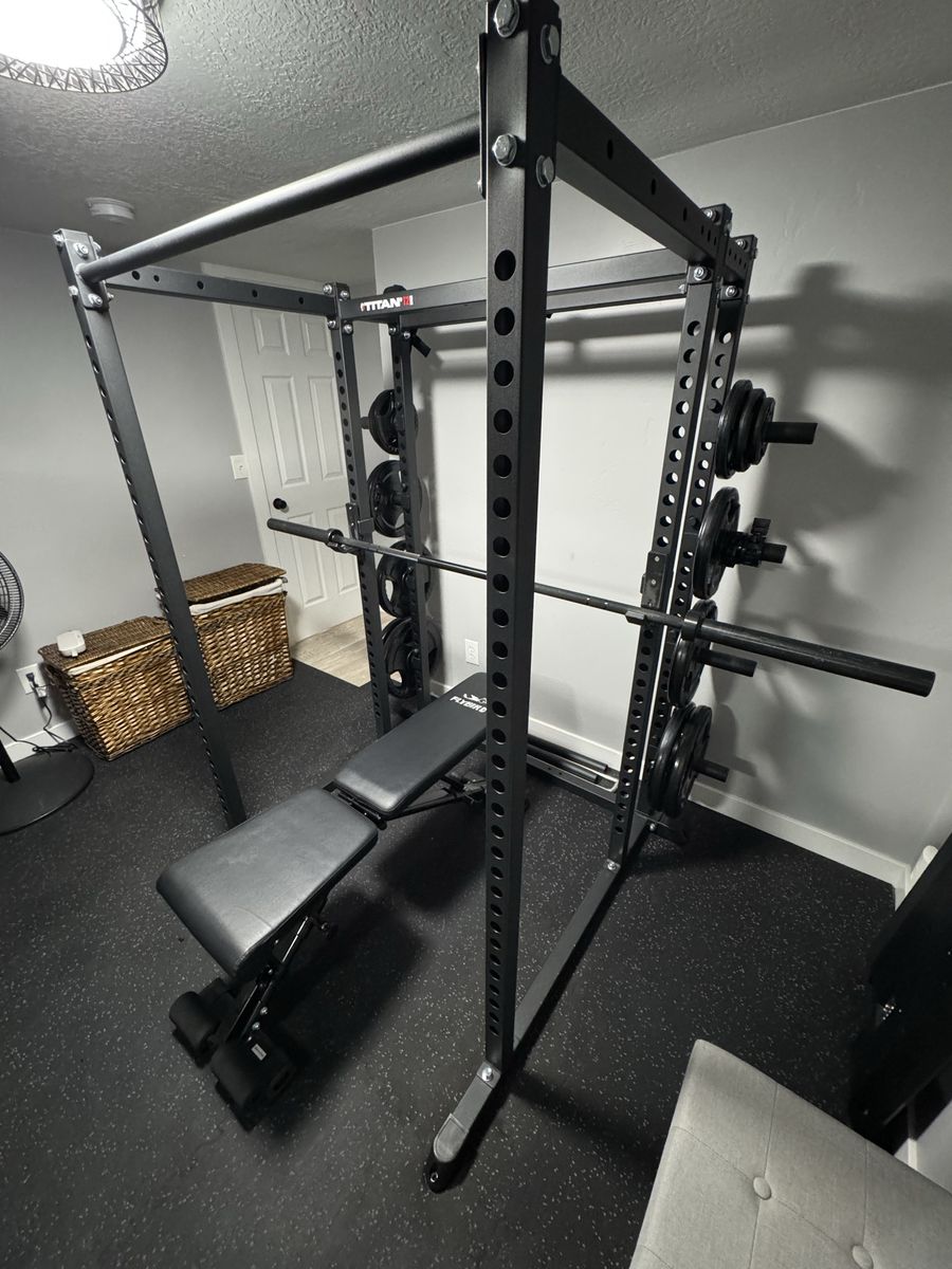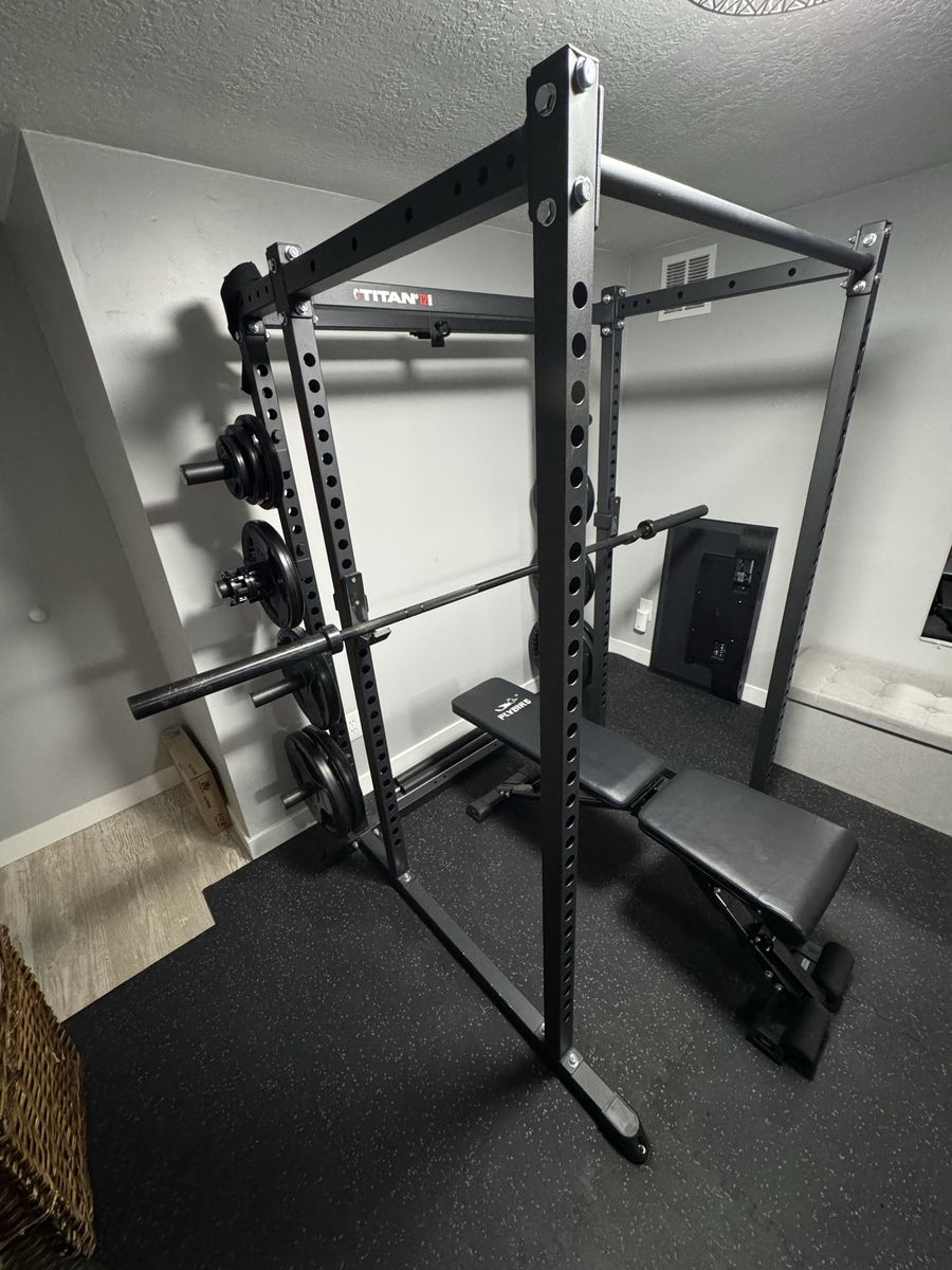 Titan T2 Squat Rack 71” Tall T-2 extension kit for plates Flybird adjustable bench 2- sleeve collars for bars 2- wrist straps 3- 36”x48” mirrors Mats included for an 8’x10’ Room