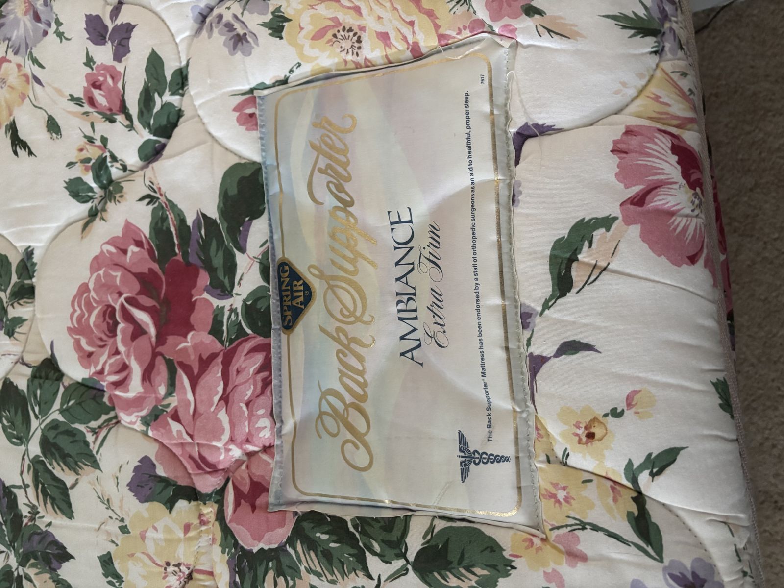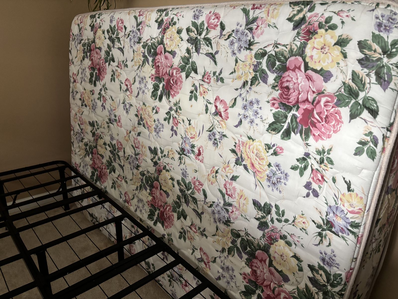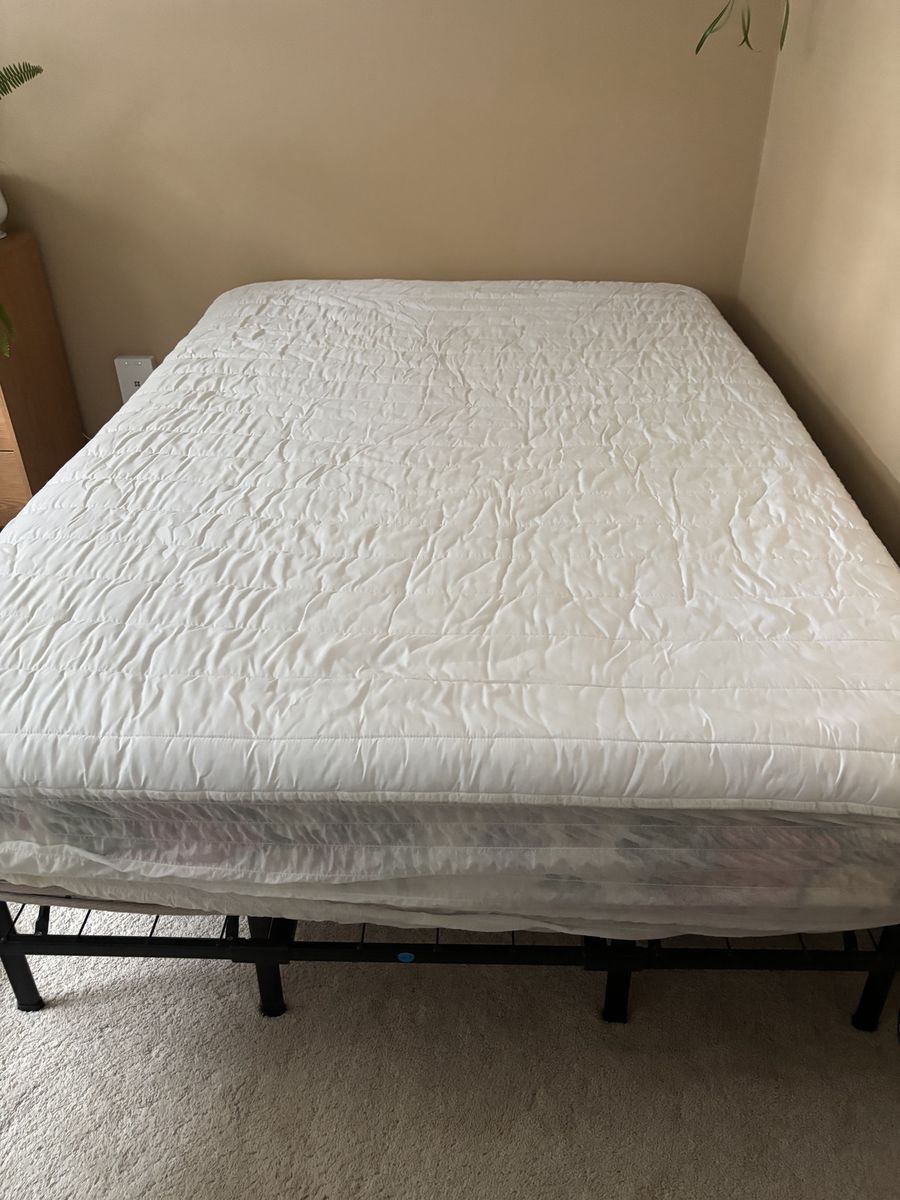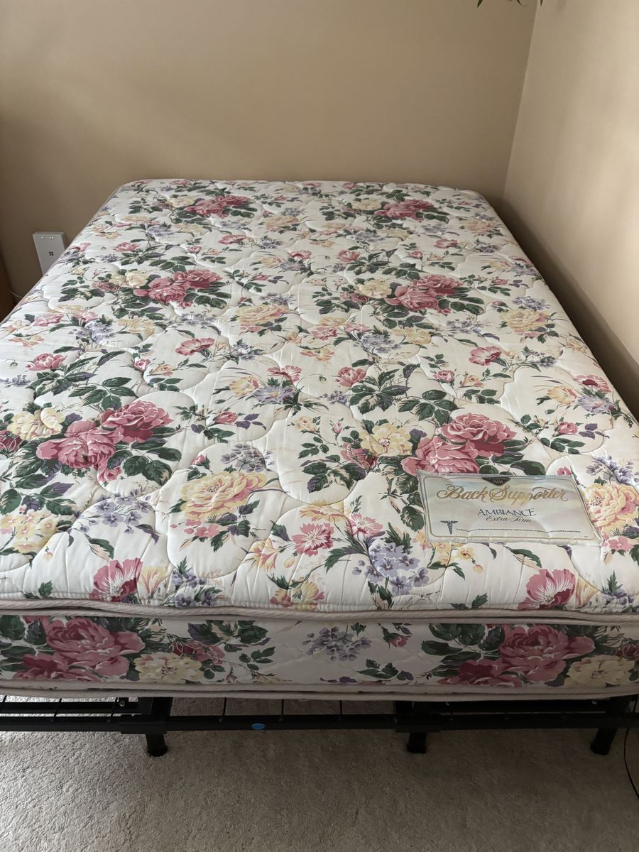 VenmoSpring Air , Back supporter extra firm mattress from my guest room in excellent shape, clean, no stains, from house with cats, pillow top so it can be flipped over to other side. Frame is metal and folds up to suitcase size, mattress protector can be included if you want it .
