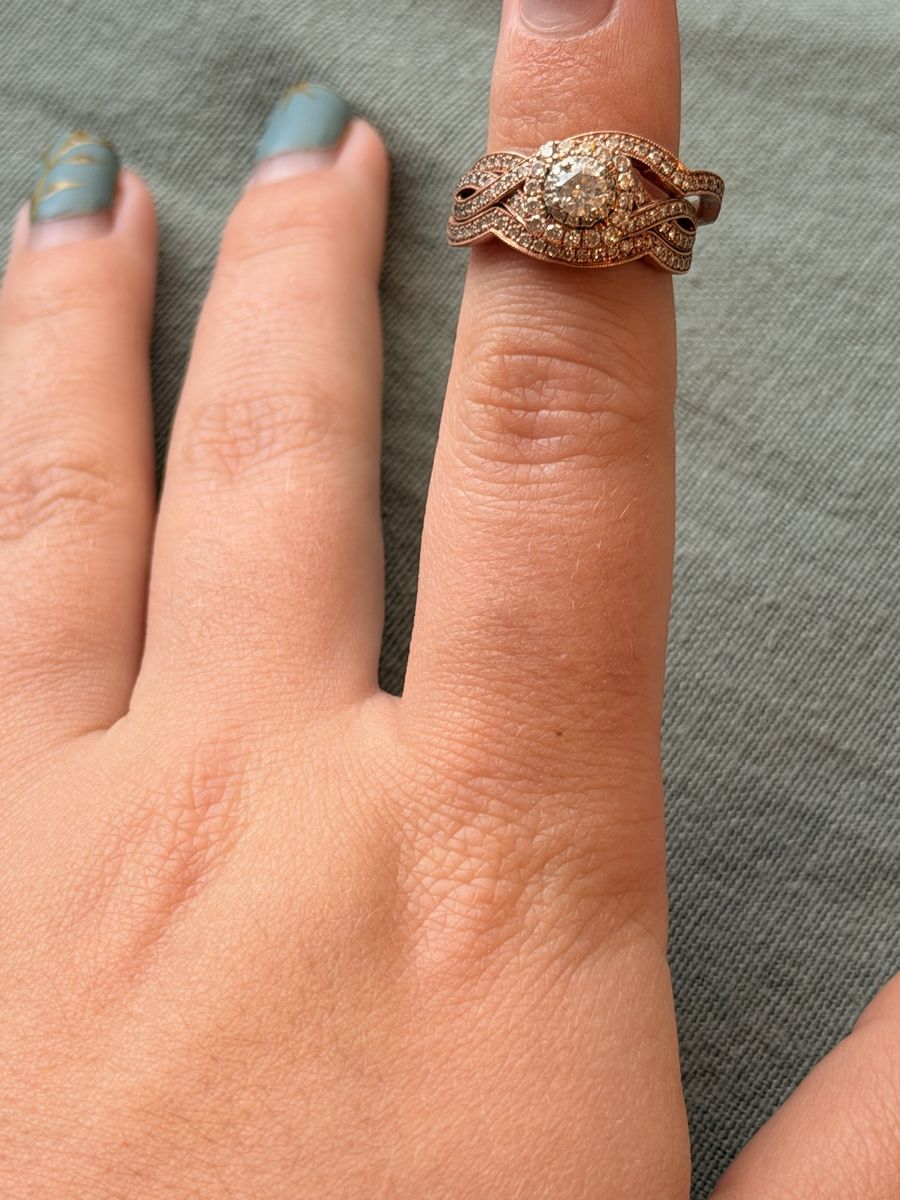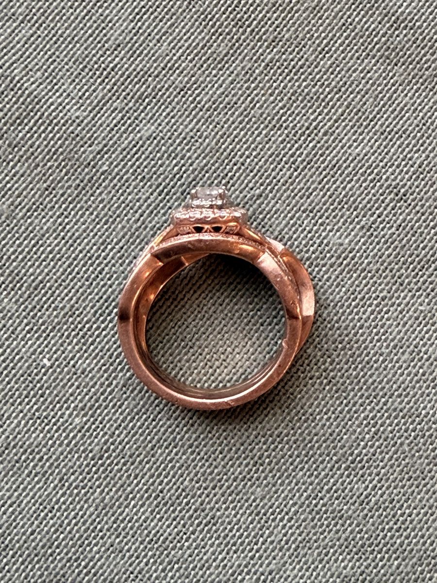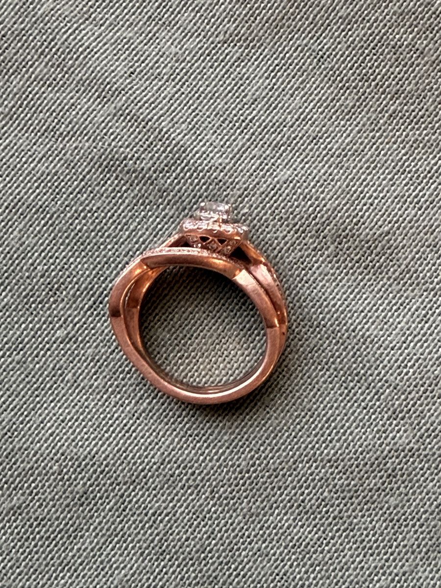 $900 OBO (or best reasonable offer, open to serious buyers) Beautiful rose gold diamond halo ring Details: • Metal: Solid 14k rose gold (warm, romantic tone — hallmarks inside band) • Design: Classic halo with intricate twisted pavé detailing wrapping around the band for a modern, romantic look • Stones: Brilliant round center diamond + surrounding halo + pavé accents along the twists (great fire and scintillation!) • Condition: it was ran over so it’s miss happen and needs to be fixed.