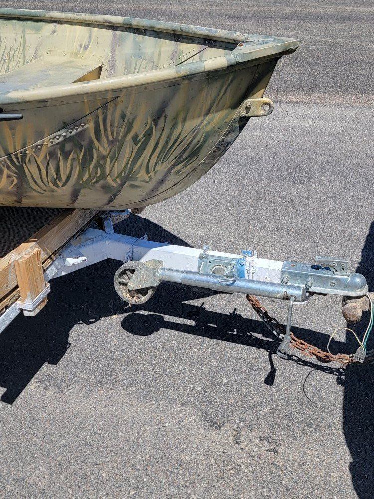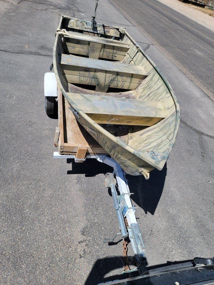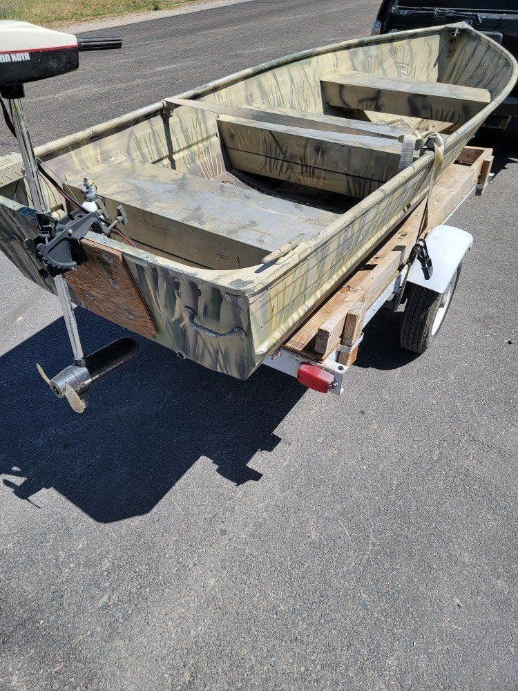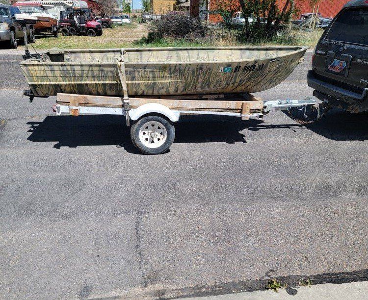 Zelle12 FT Aluminum Boat, Water tight, Electric trolling motor, 3 bench seats, currently registered, It is light weight that you can easily pick it up but very durable. When you flip the boat over it is ready for winter and easy to maintain. The trailer is in good shape, It is a tilt deck model for easy loading in shallow water. It can also be used to haul ATVs or whatever you would like. It has good tires, newer jack and receiver. This is a nice little set perfect for local ponds or lakes. Call or text if interested 801-six23-192six