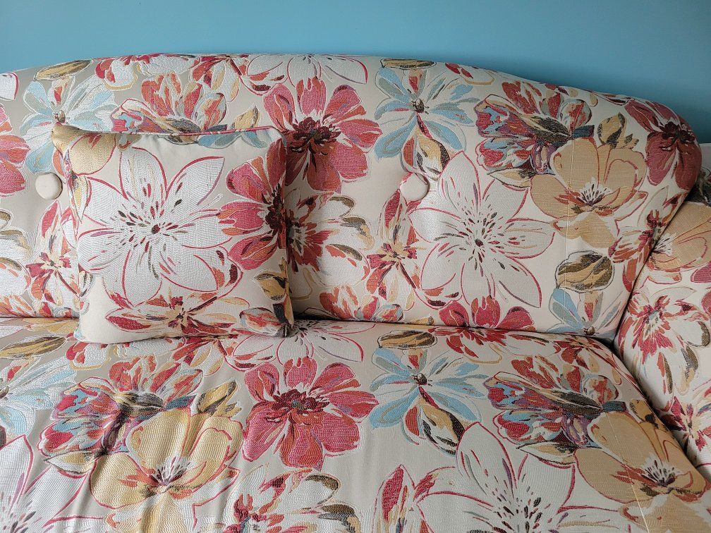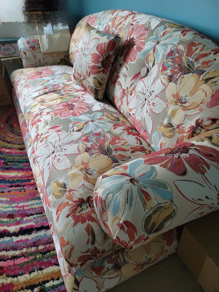 VenmoBold red, blue, tan flowers on creme background. Firm cushions. 84" wide x 40" deep. 5 yrs old.