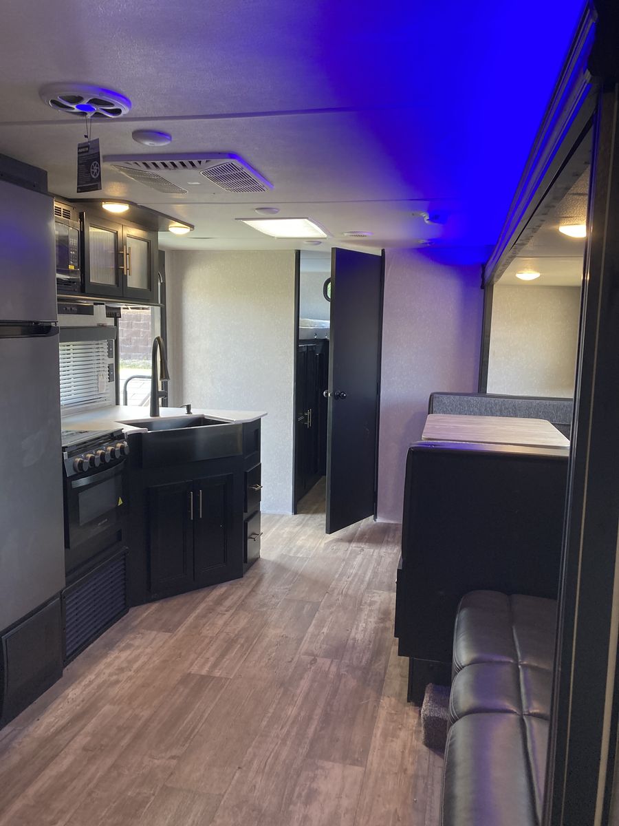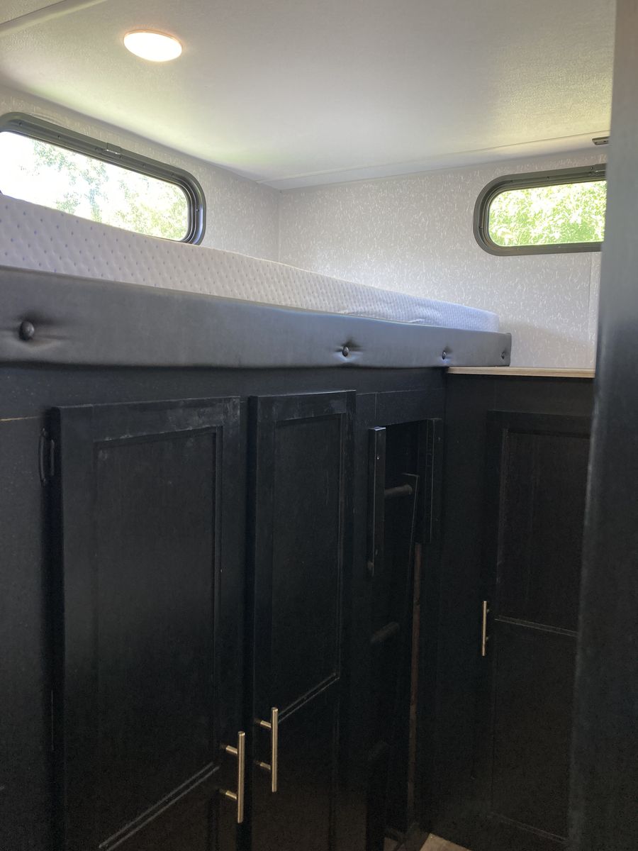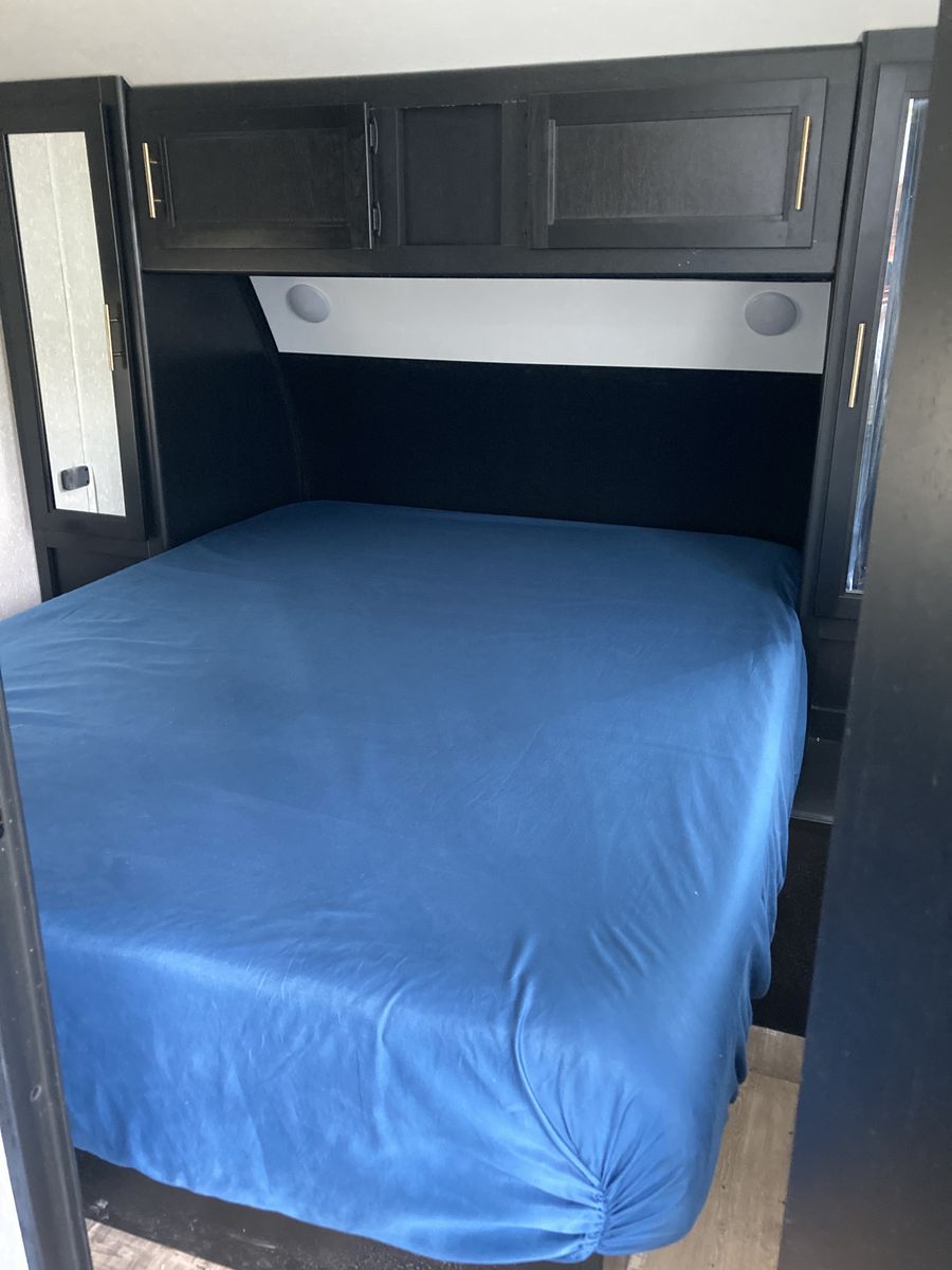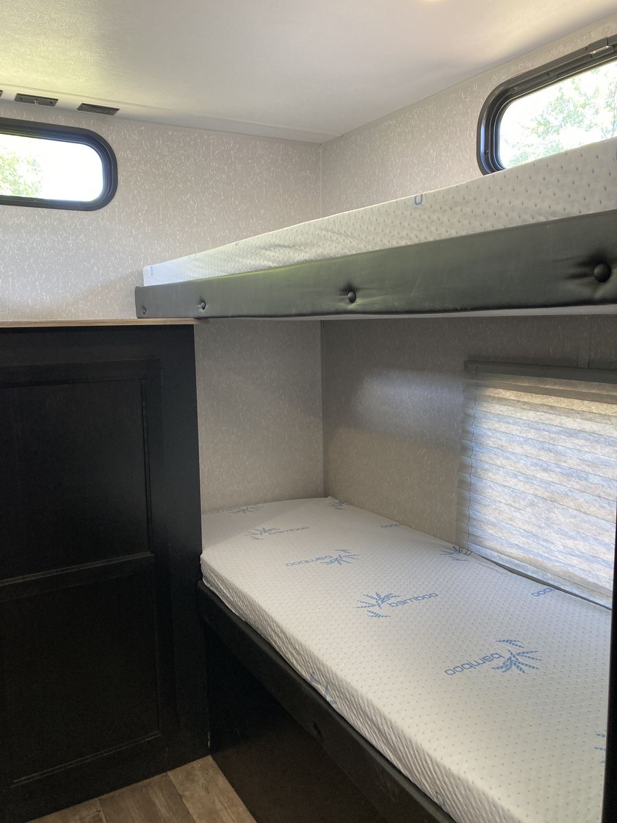 It has a Front bedroom with a queen-size bed and private access to the bathroom and shower, The three bunkbeds are in the back room. It has nice glass doors, a power awning and rear camera with remote app for viewing from tow vehicle.