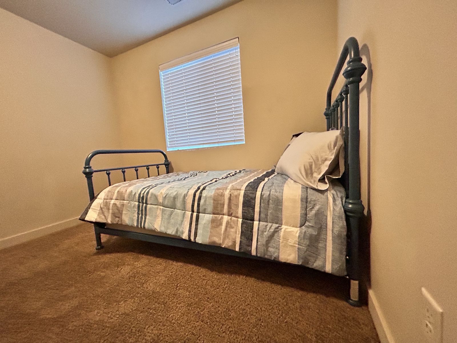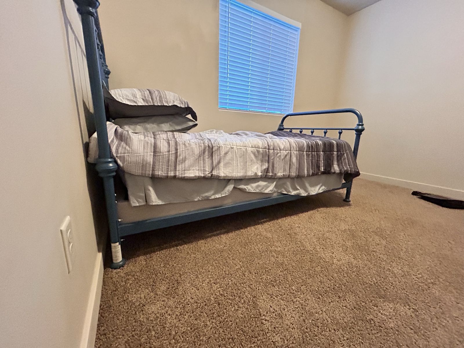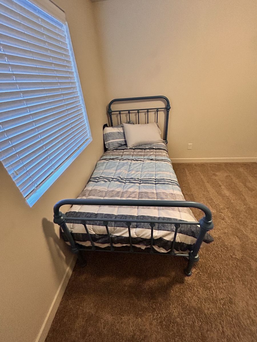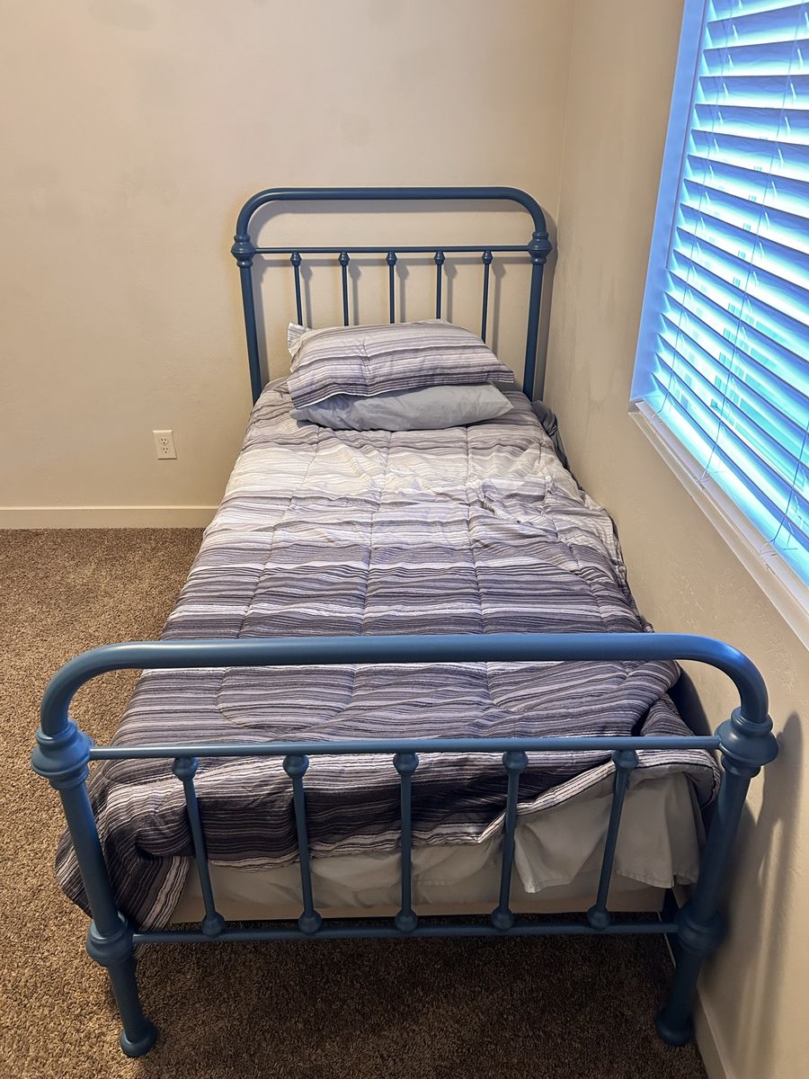 VenmoSelling two matching twin-sized metal bed frames in a matte blue finish. The frames and striped bedding are fairly new and in great condition, the mattresses are older. There are two, $60 each or $100 for both.