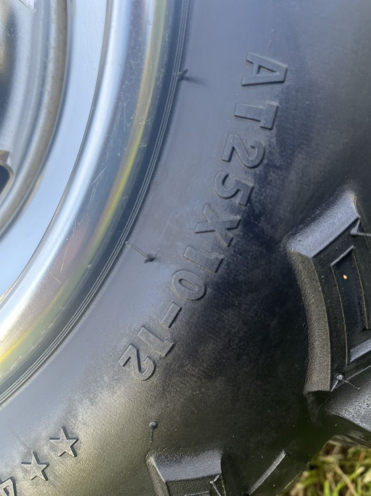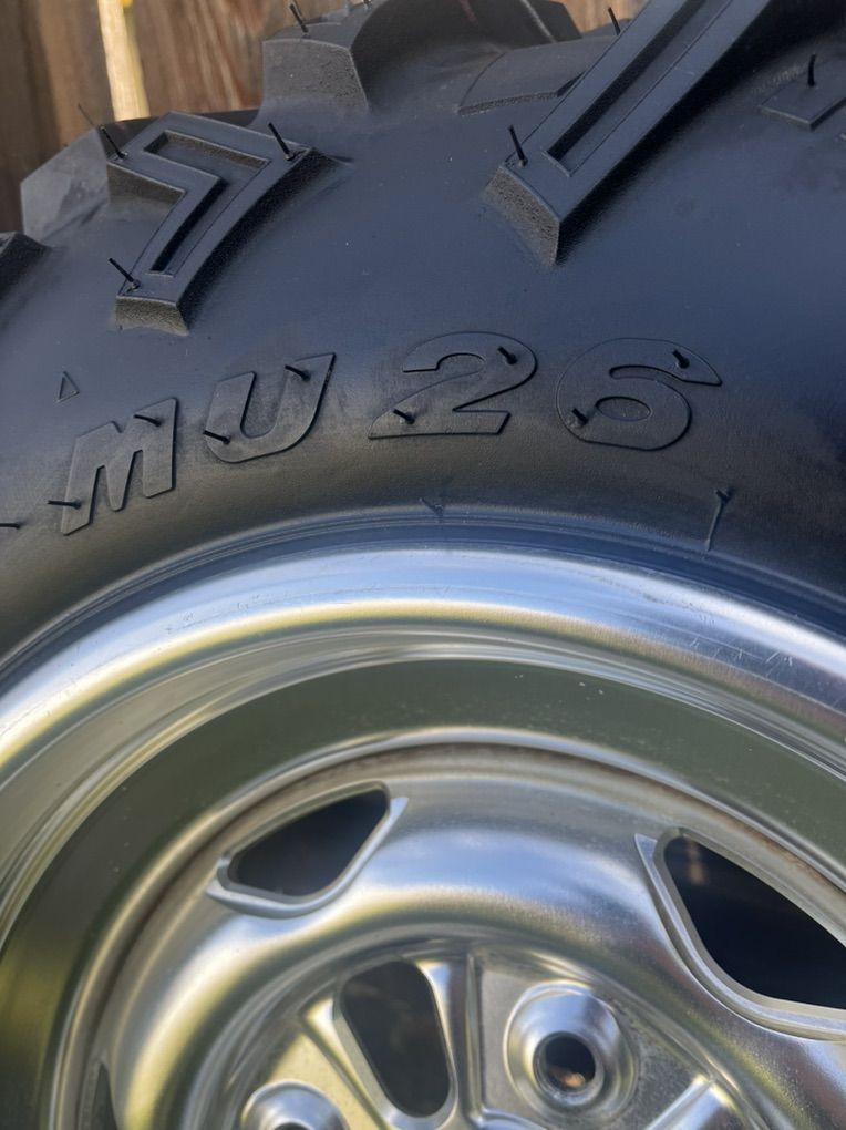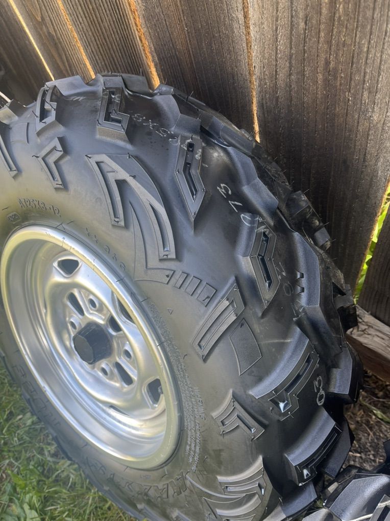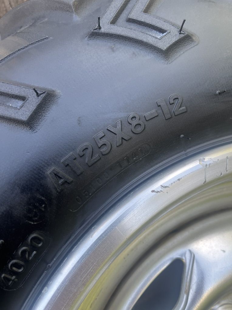Tires are brand new factory tires you can only buy through the dealer. I bought the wheels used off of a Honda Rincon, but they will fit other machines. Some Yamaha, Suzuki and CF Moto models