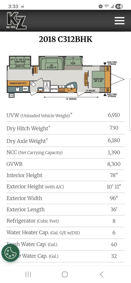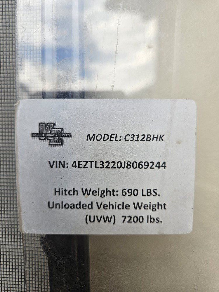 Well taken care of bunk room trailer. 2018 K-Z Connect C312BHK. We are the second owner, used just a few times a year. 31 ft interior (36 ft bumper to bumper with hitch). Has separate bunk room and second entry into bathroom. New tires with less than 500 miles on them. 2 slides, 16 ft awning, sleeps 8-10. Also has a full outdoor kitchen with sink, fridge, hot plate and connecting gas grill. Plenty of storage inside and out. Message with questions or to come see it.