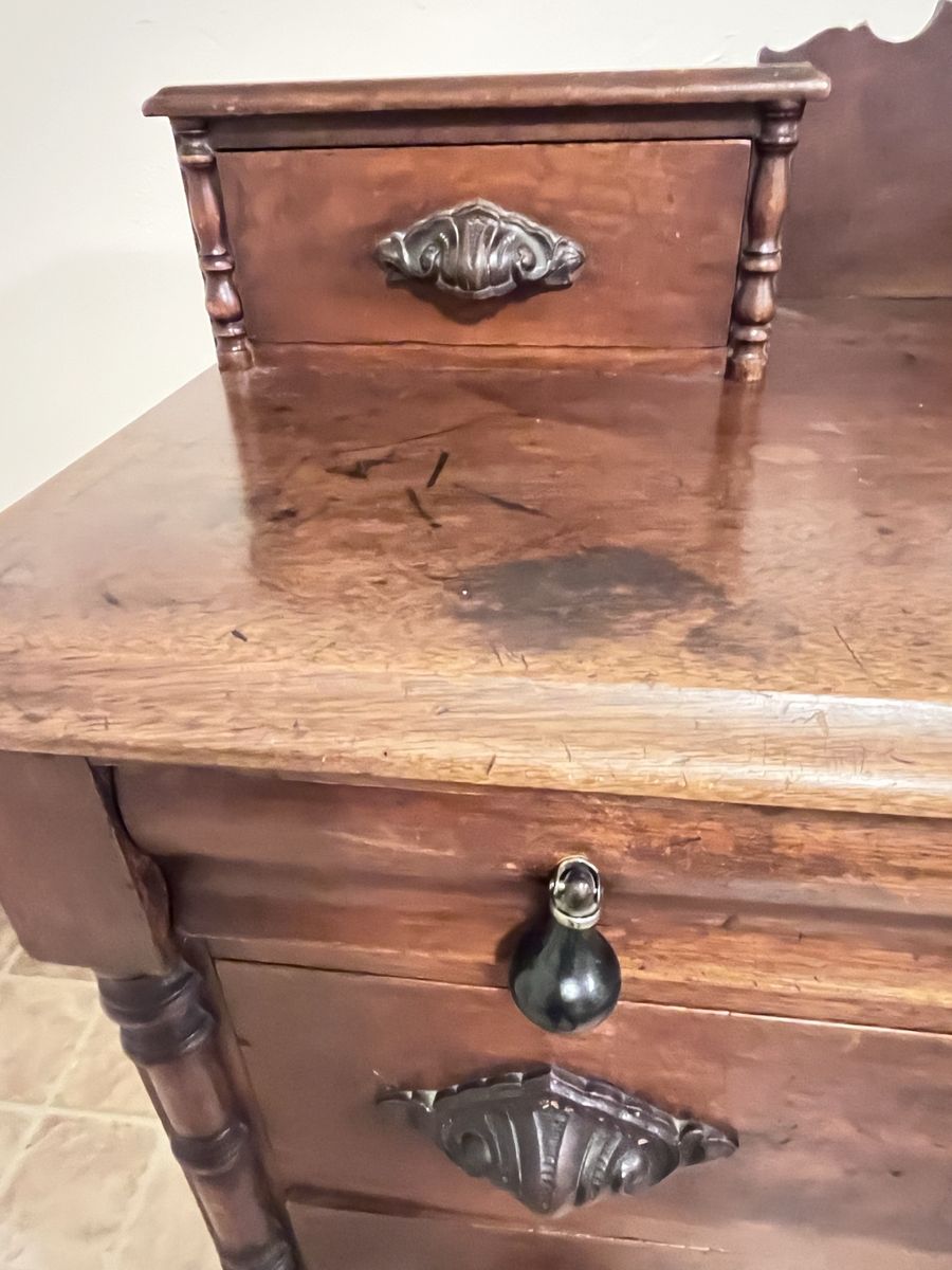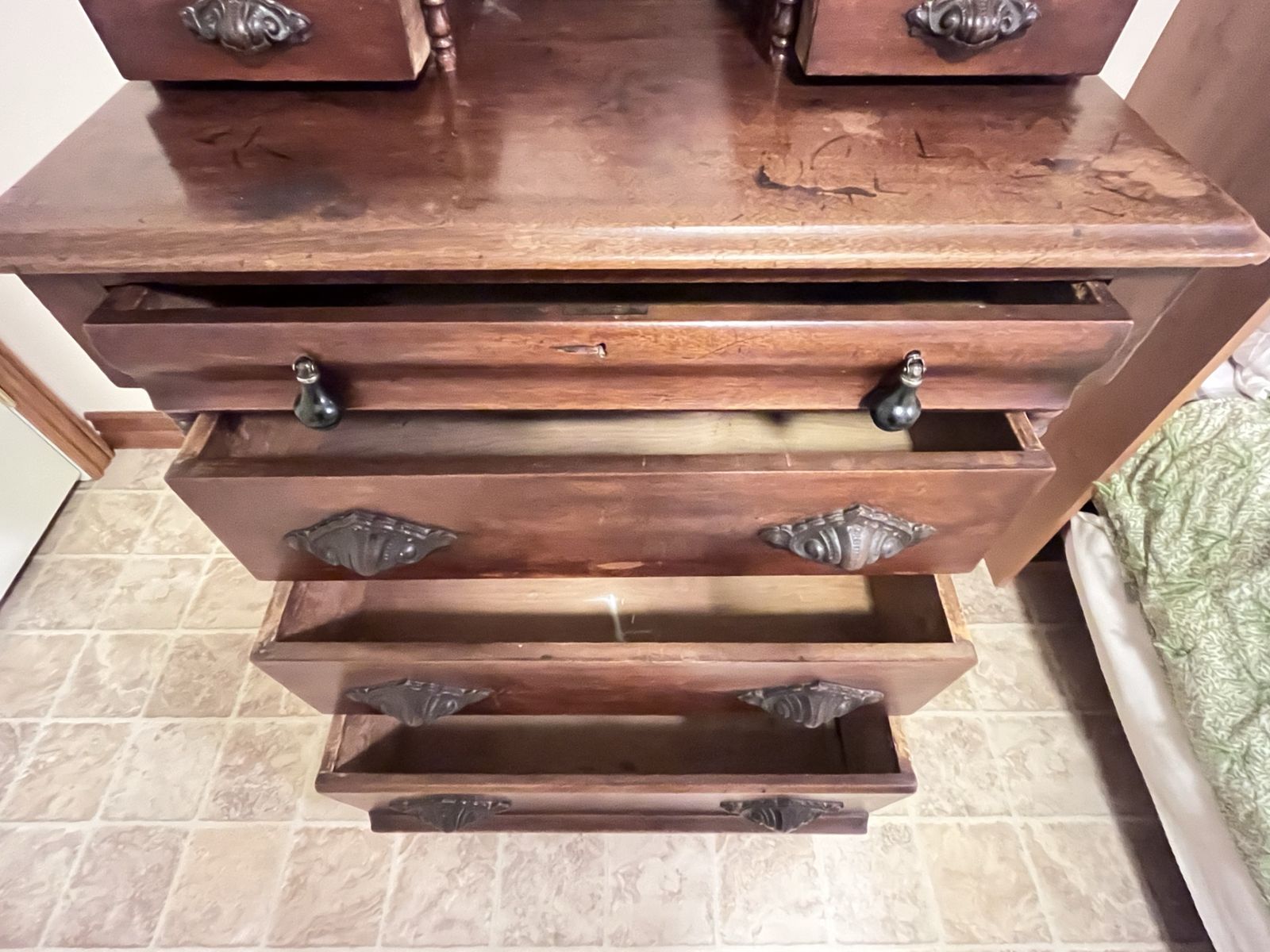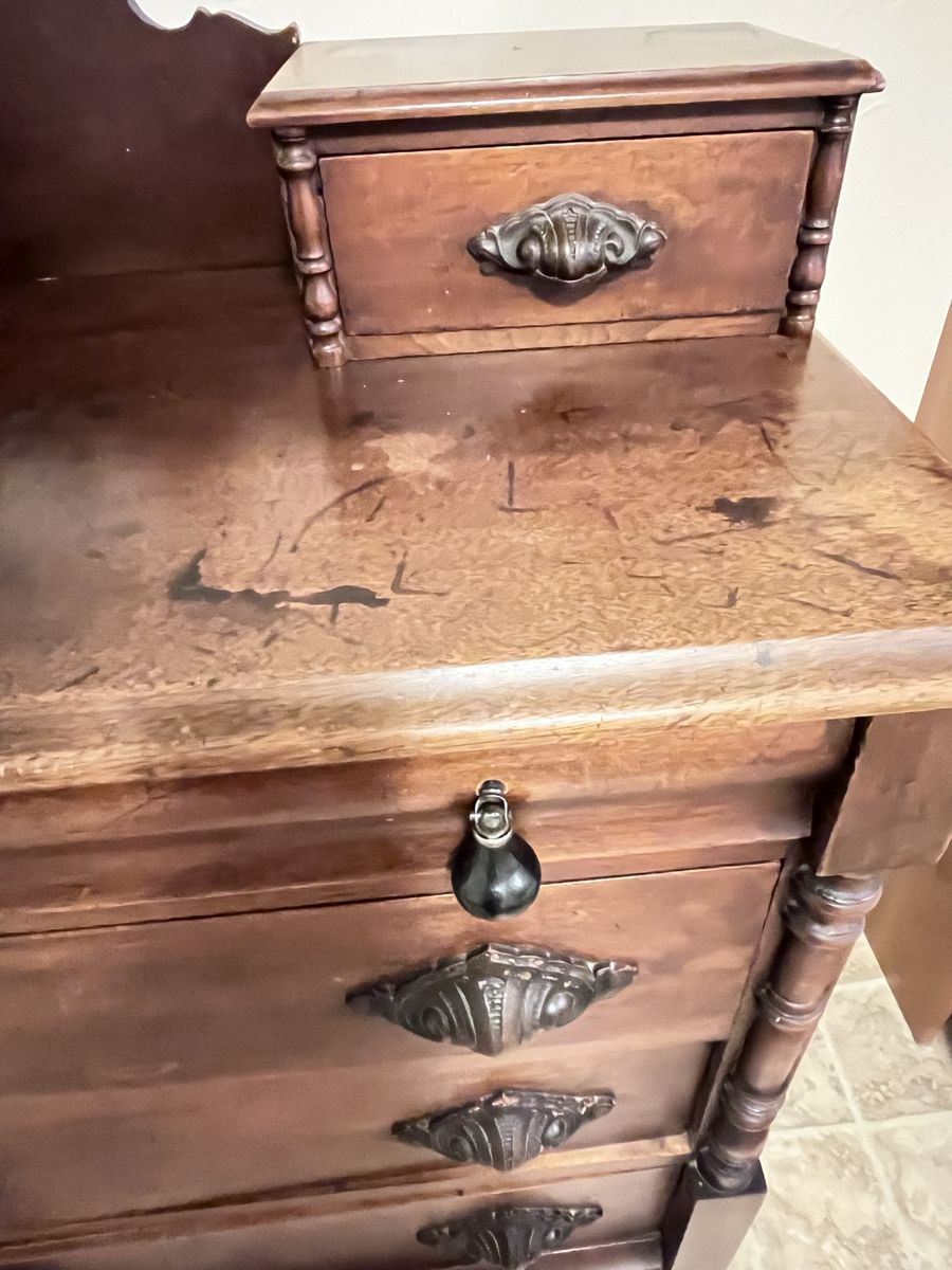 VenmoSolid hardwood bureau (circa 1900) in two pieces. The small drawers on top are one piece. Original finish. All drawers work well. Possibly from Norway.