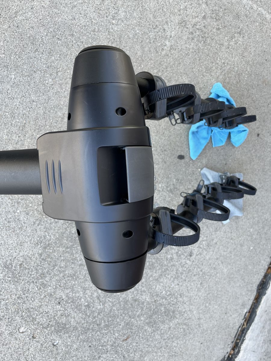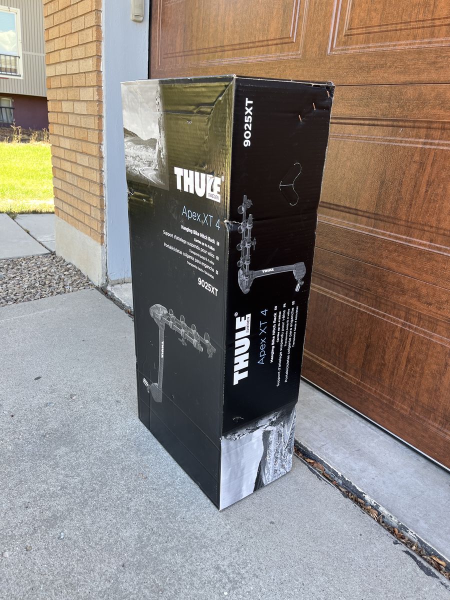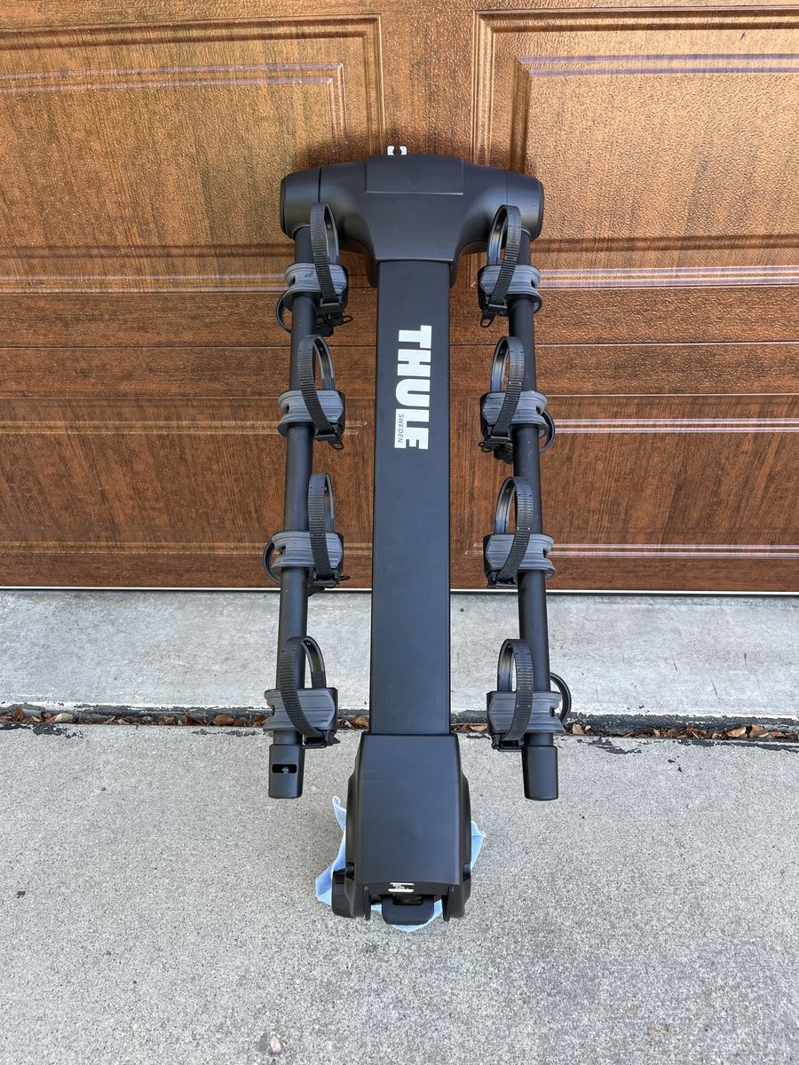 Original box and all accessories included. Holds four bikes, has integrated bike lock, anti-sway bike mounts, arms fold down and the rack tilts away from the tailgate. Works with 1.25" and 2" hitch with included adapter. Integrated hitch lock.