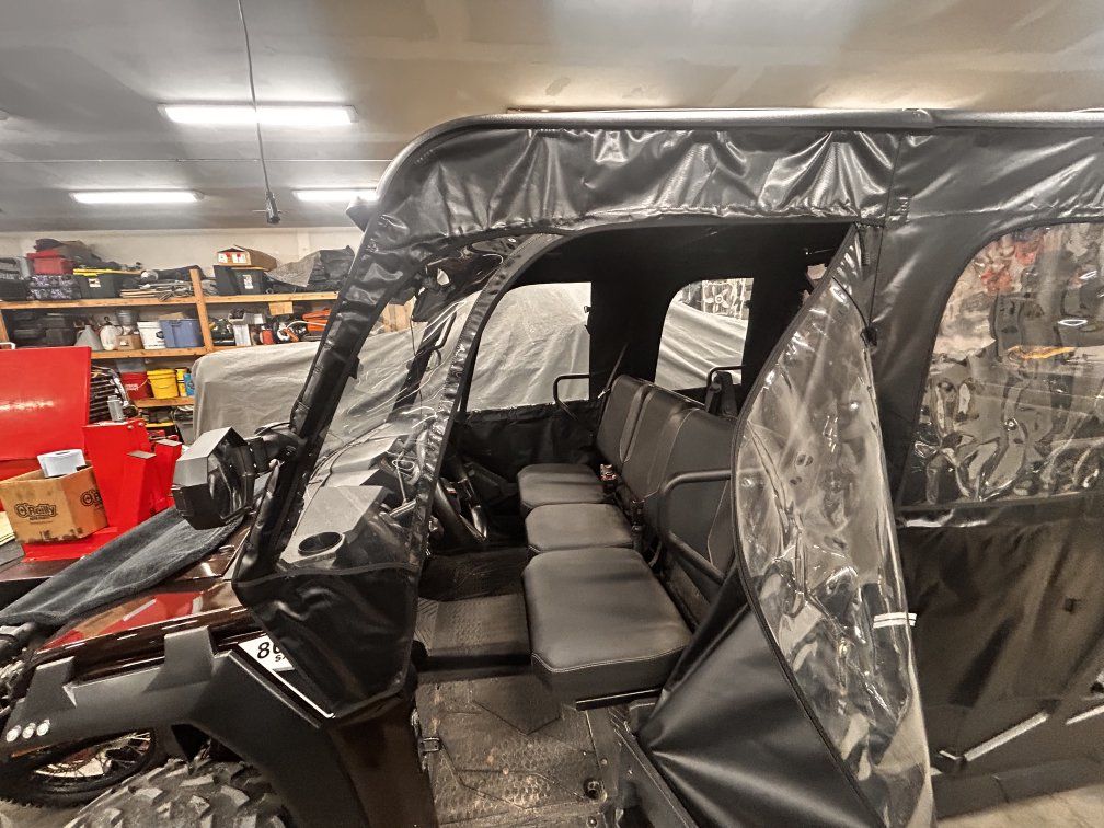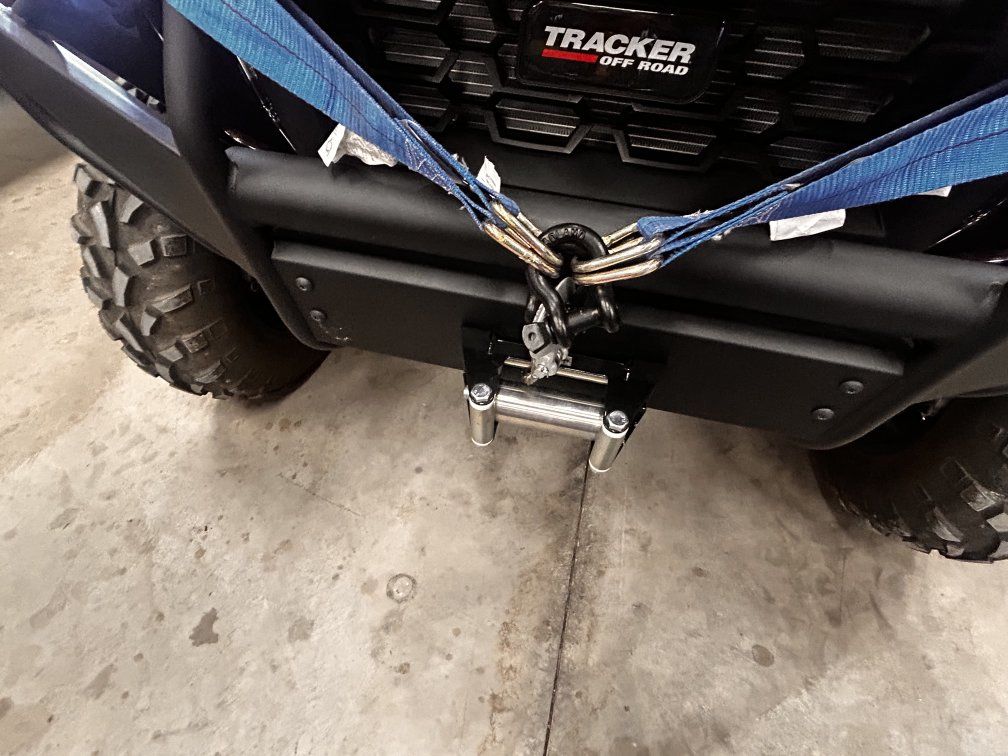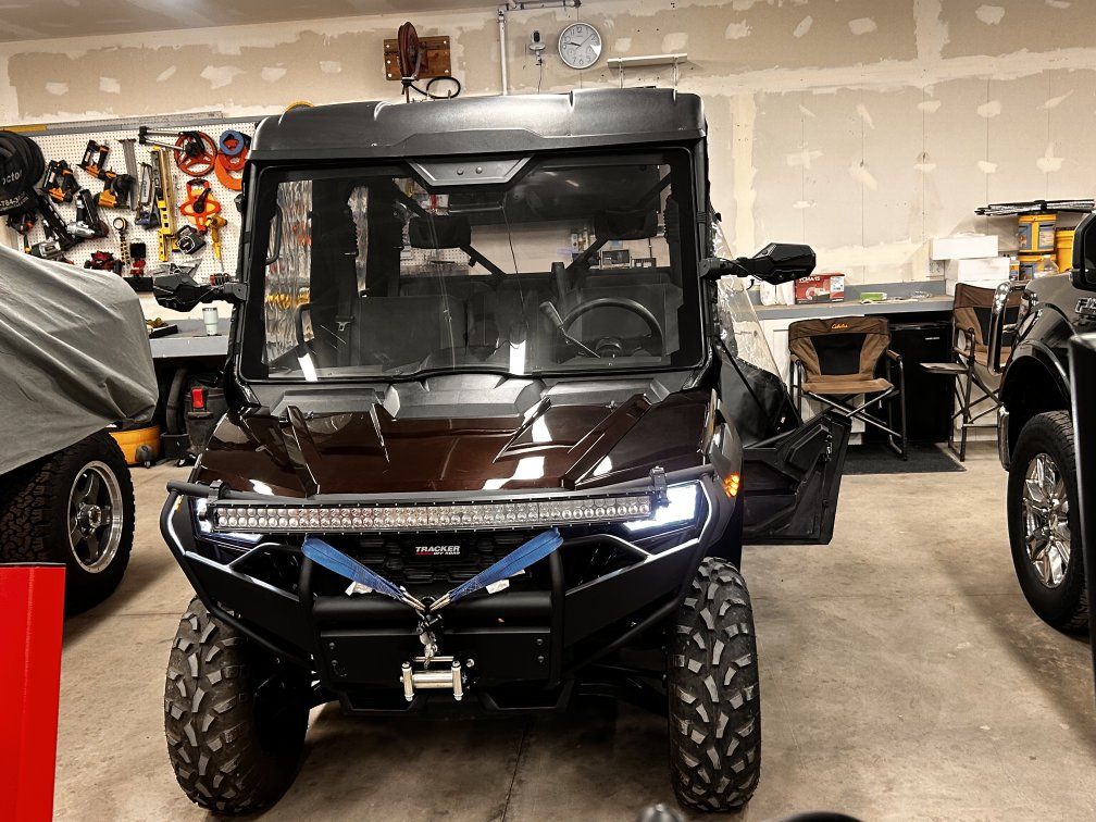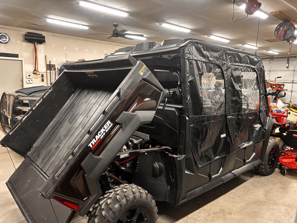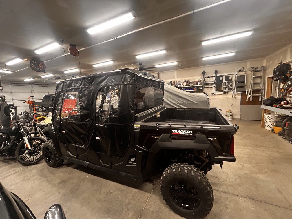 2023 Tracker 800 SX LE Crew 177 miles on odometer 4X4 (Rear locker on separate switch) Tilt steering 6 seater with seatbelts Brown and black 42" Lightbar LASFIT LED headlights Front grille gaurd Warn VRX 45 4500 lb winch with 1/4" nylon cable Real glass windshield Mirrors with blinkers and 2 color LED running lights (Blue/ Green) ABS plastic top Soft zip up doors Cab fully enclosed. Plexy glass back window 50% tinted Shock assisted Tilt bed Backup camera with 7" screen under the rear view. On/ off with toggle switch Screen is BT capable with small speaker in it for music 2 USB charging ports and 2 cigarette lighter charging ports on dash Street Leagal kit (Blinker lever, blinker/ marker lights, and horn) Storage behind rear seat Adjustable shock front and rear