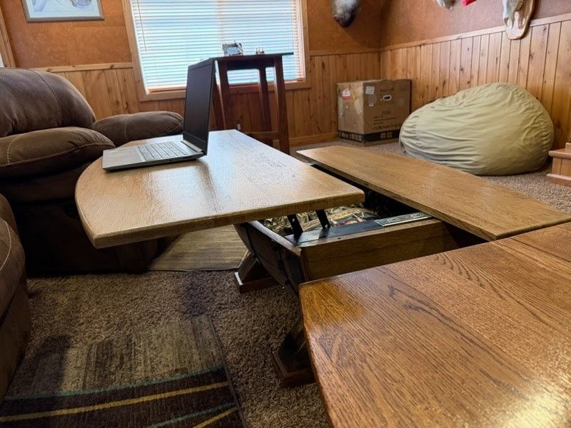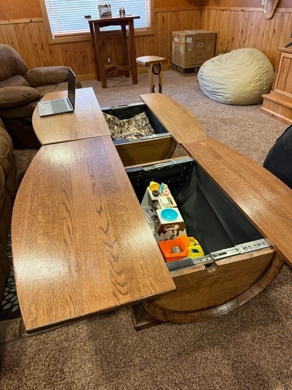 Venmo2 handcrafted and beautifully built whiskey barrel coffee tables. The table top opens to allow easy access to the inside of the barrel. With the tabletop open, it reaches easily up to your couch or chair and allows you to place and use your devices easily. Great for storage and would look good in any living room. The dimensions are 46 inches long by 32 inches wide by 18 inches tall. Asking $700 or $1200 for both. Open to legitimate offers.