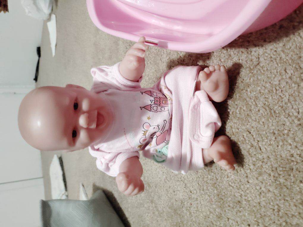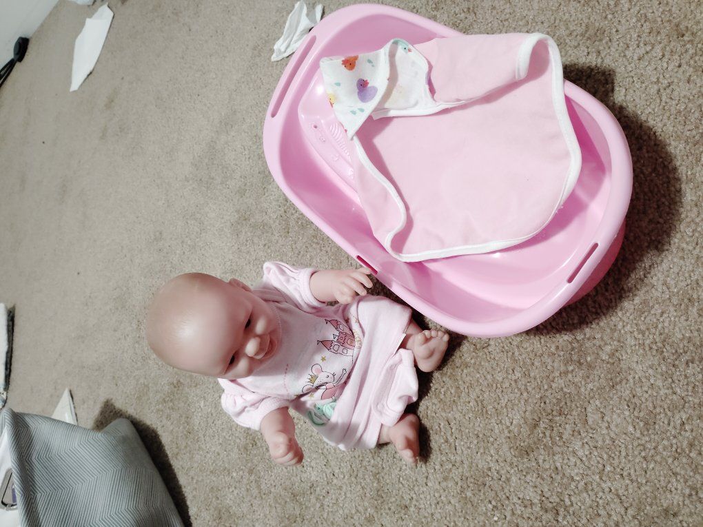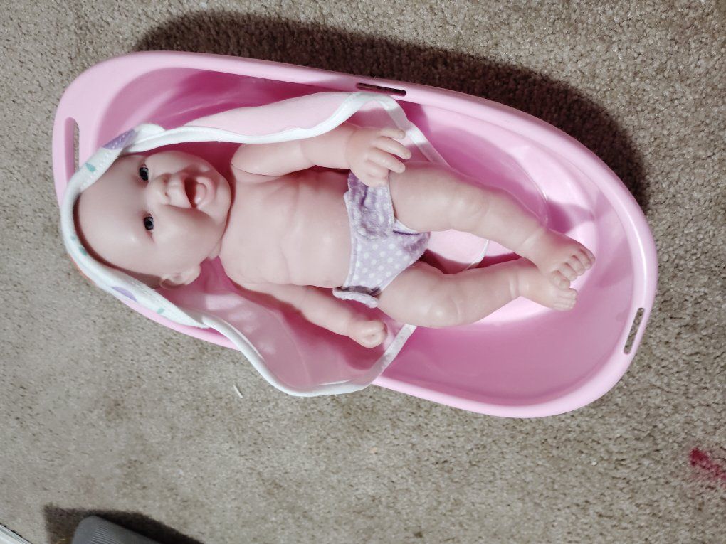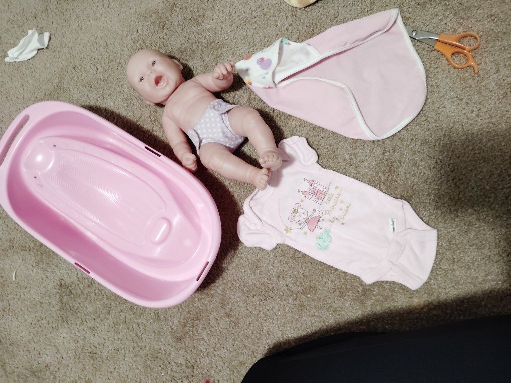 Venmowas going to keep this for my daughter's birthday, but she has enough "babies", we can let this go and get her something different. bathtub, baby, diaper, towel, and outfit all included for $7. smoke and pet free home. I cleaned and sanitized the best I could; bottom of bath is still stained. the outfit is a preemie size. I can get measurements of the baby and bathtub, if that's wanted.