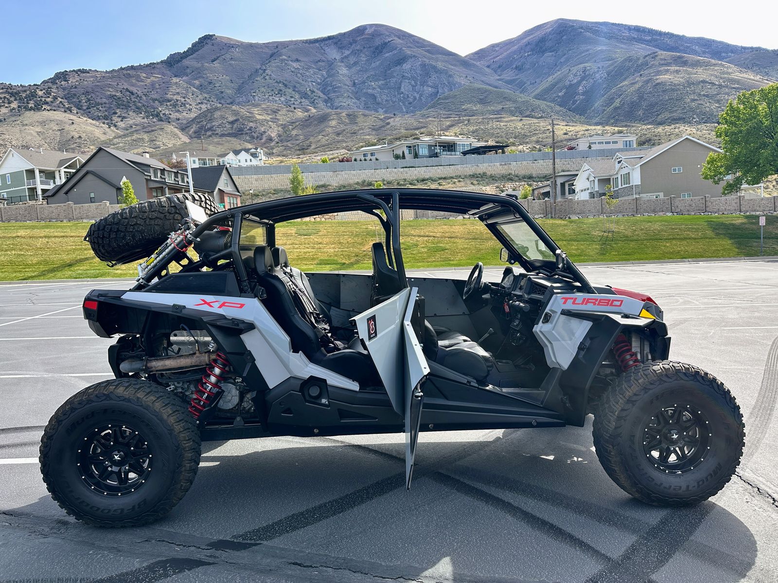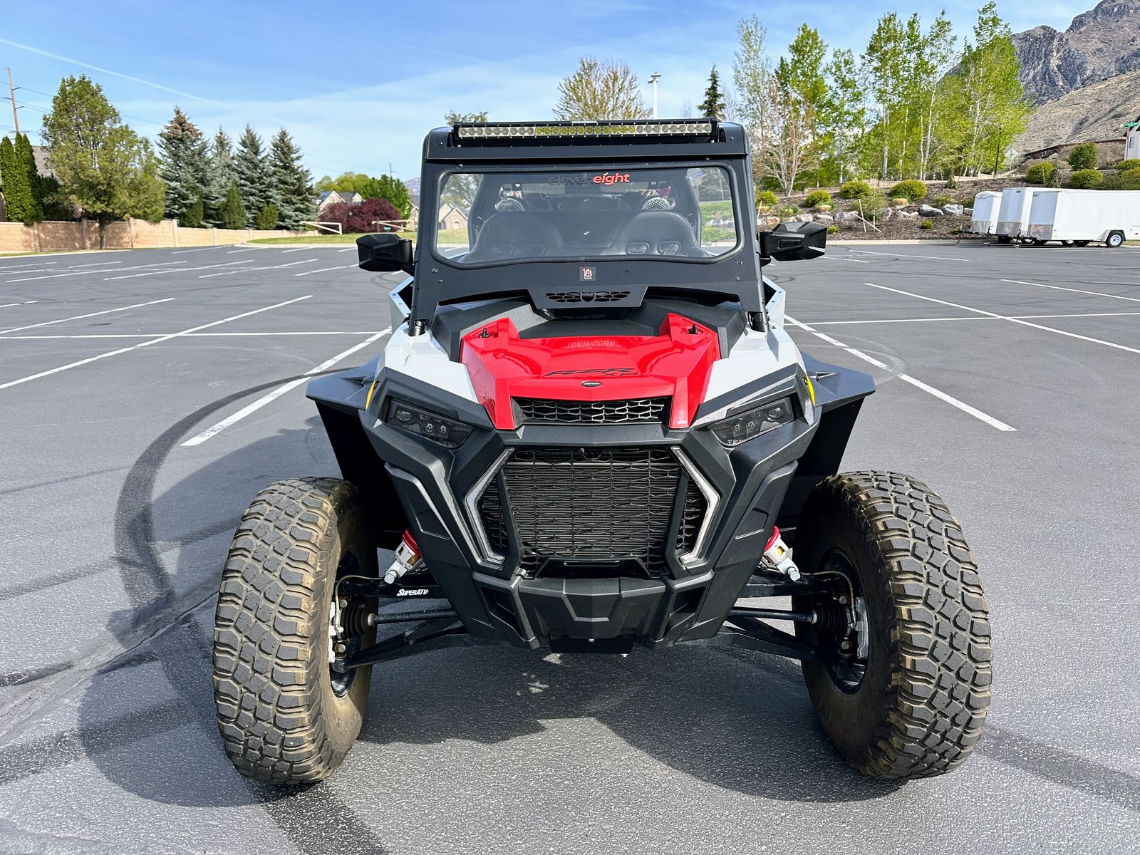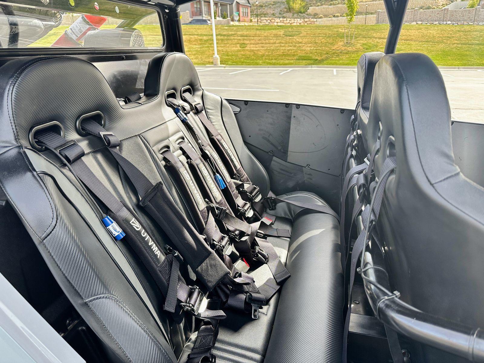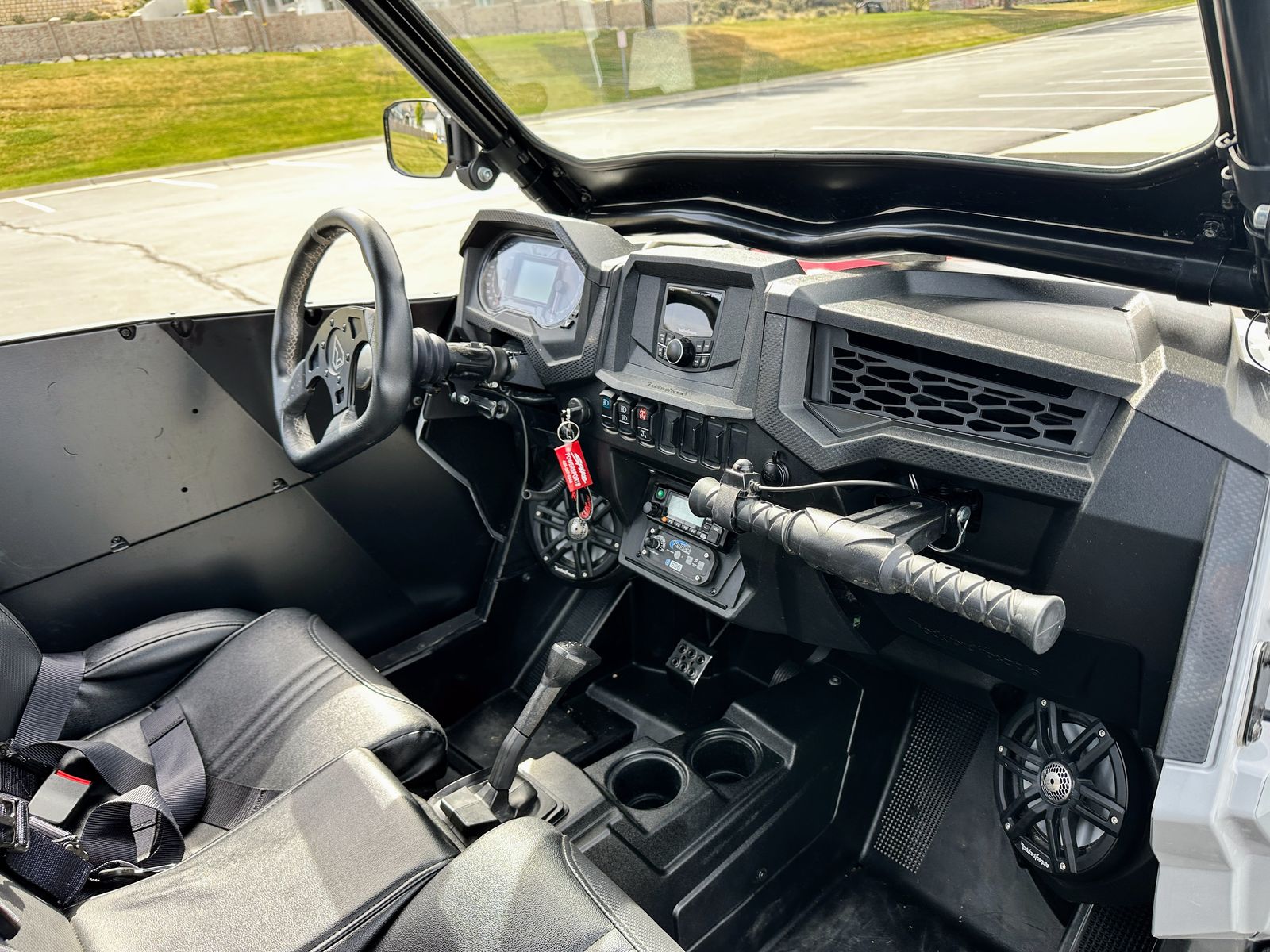 This isn't a stock RZR with a couple bolt-ons. It's a complete build — custom cage, full doors and windshields front and rear, Rockford Fosgate audio, Rugged Radio intercom, Super ATV arms and radius rods, Moto Armor protection, MSA wheels, 32" BFGs, street legal kit, and a 6-seat UTVMA bench conversion. One-of-a-kind two-tone grey and black with red highlights. Everything works exactly as it should.