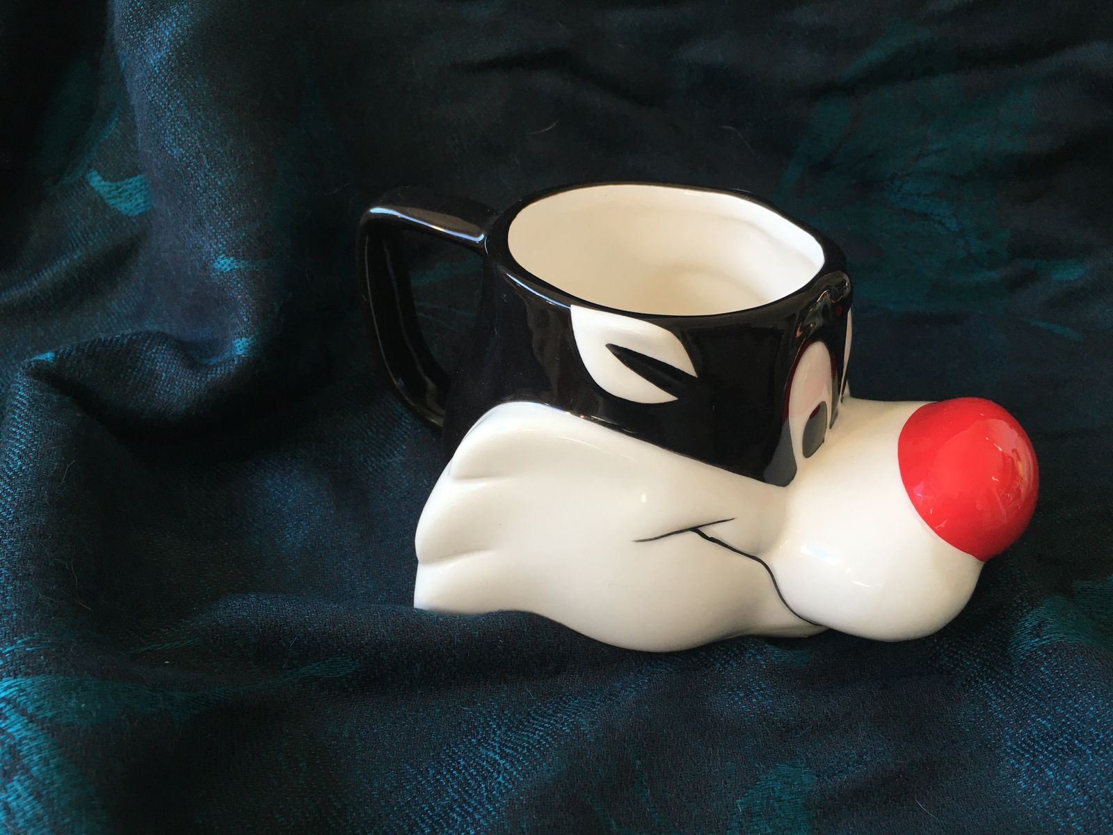 Sylvester measures 3 1/4" tall and about 6 5/8" across from the tip of his nose to the handle. He's in great shape with no cracks or chips and only a few signs of wear on his nose--a few pinpoint spots of paint loss.
