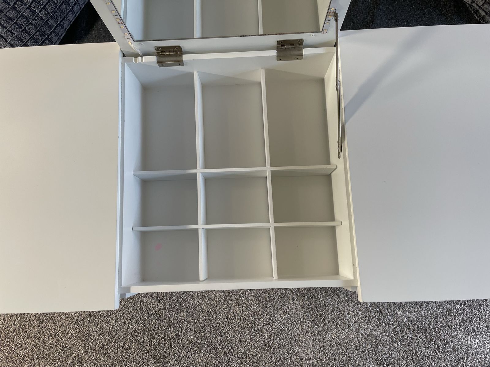 PayPalUsed vanity dressing table with a flip-up mirror and cushioned stool. It’s has a few minor flaws (please see photos). Please also see the last photo for exact measurements. 35.43 x 15.75 x 44.09.