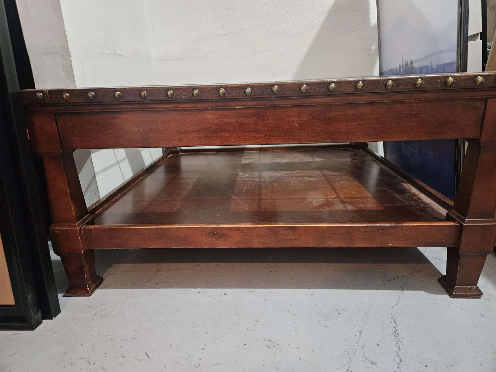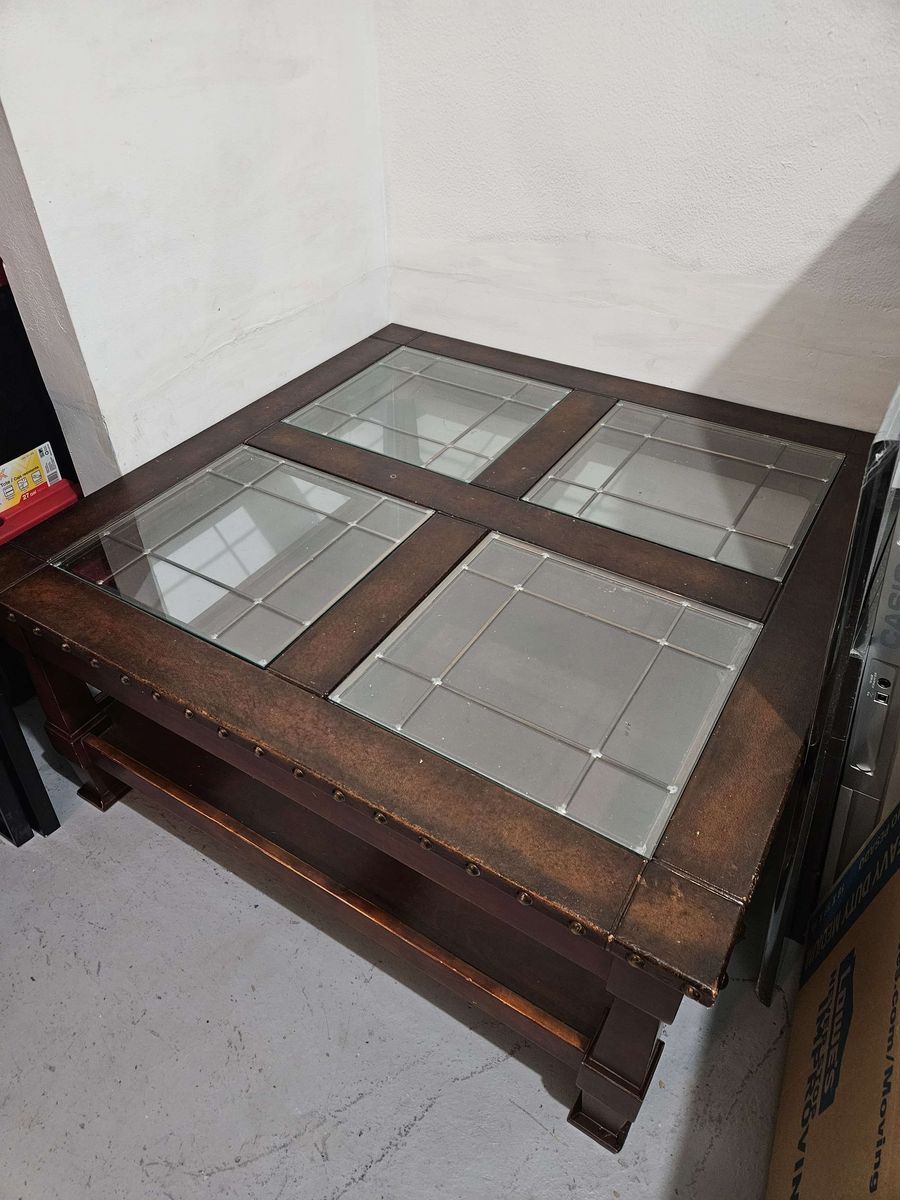 VenmoI just moved into a smaller place (hence all the boxes in my photos) and do NOT have room for this beautiful piece. It’s too pretty to leave in my basement, so we’re looking for someone who will make good use of it! It’s needing a thorough clean after moving and has VERY minimal damage, but otherwise is in excellent condition. Heavy!!! Made out of good solid wood, metal studs, and pleather. Comes from a smoke and pet free home.