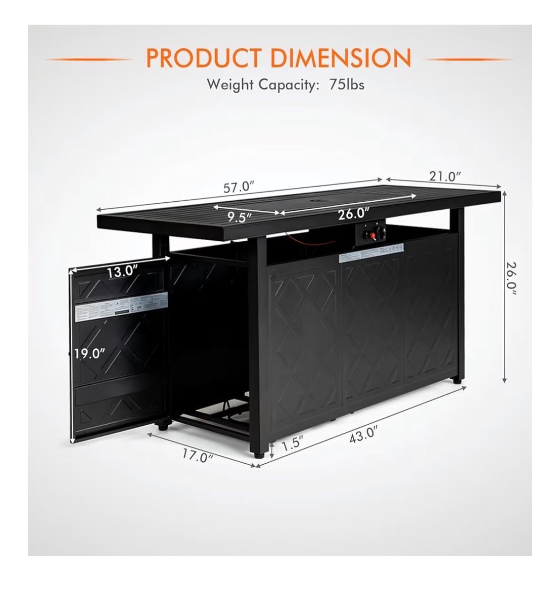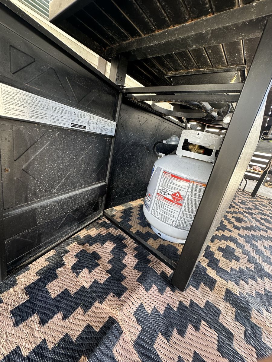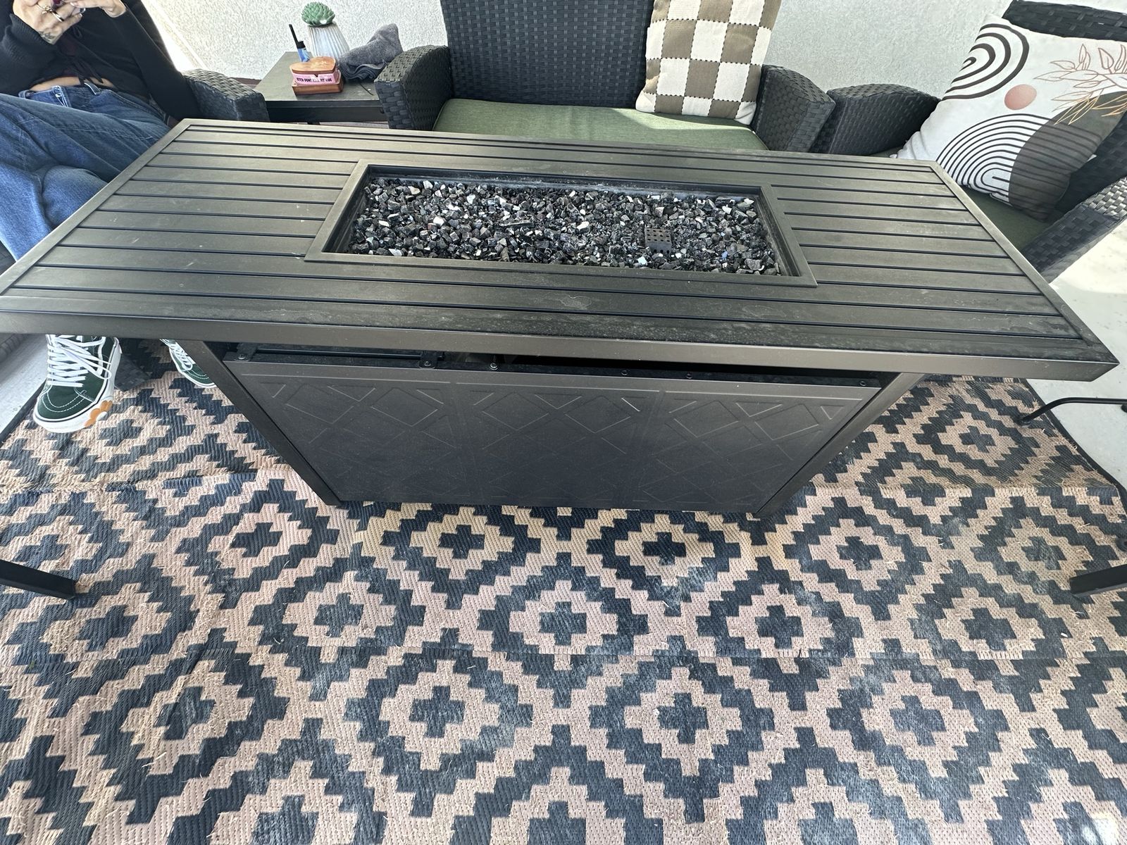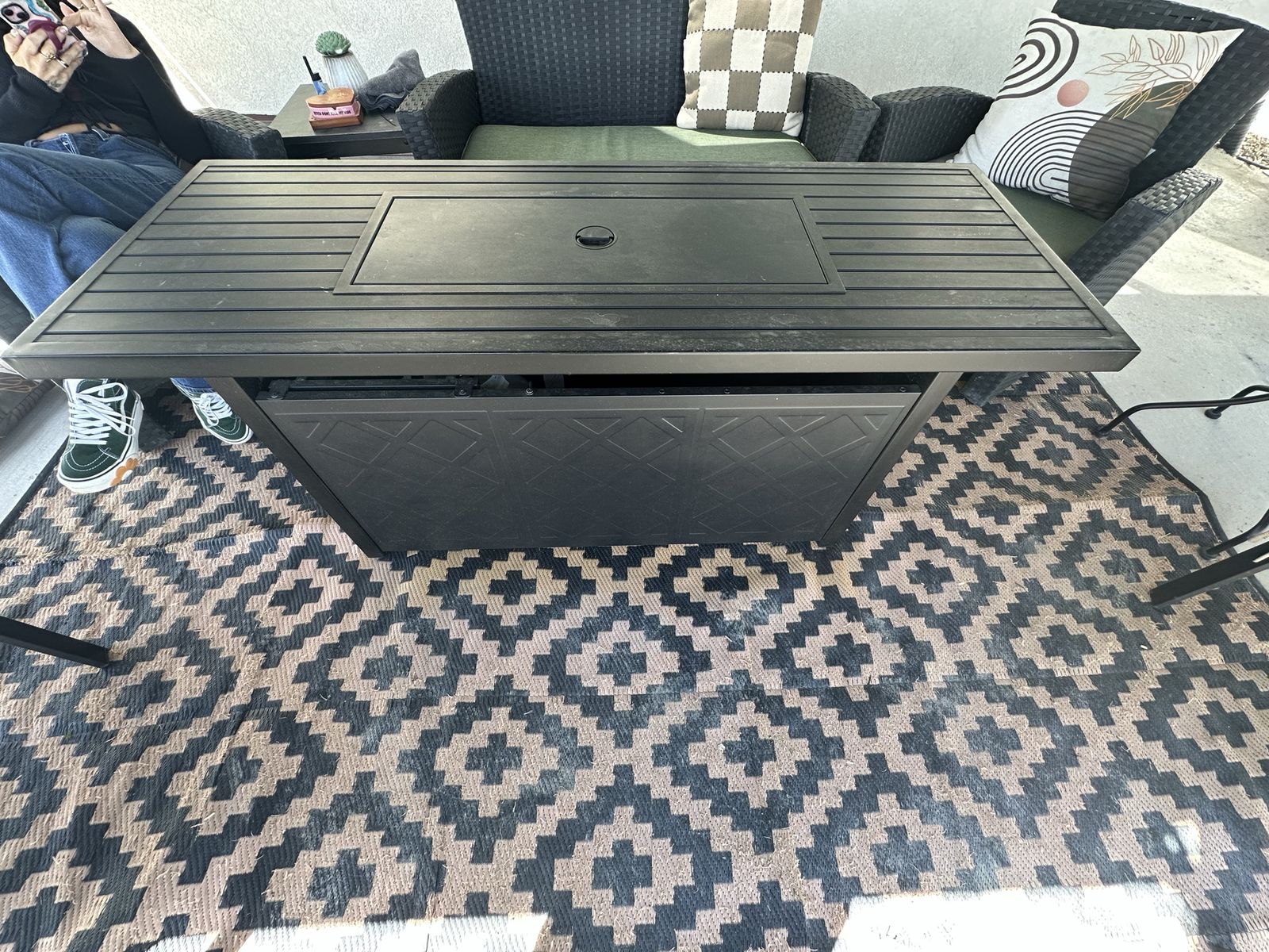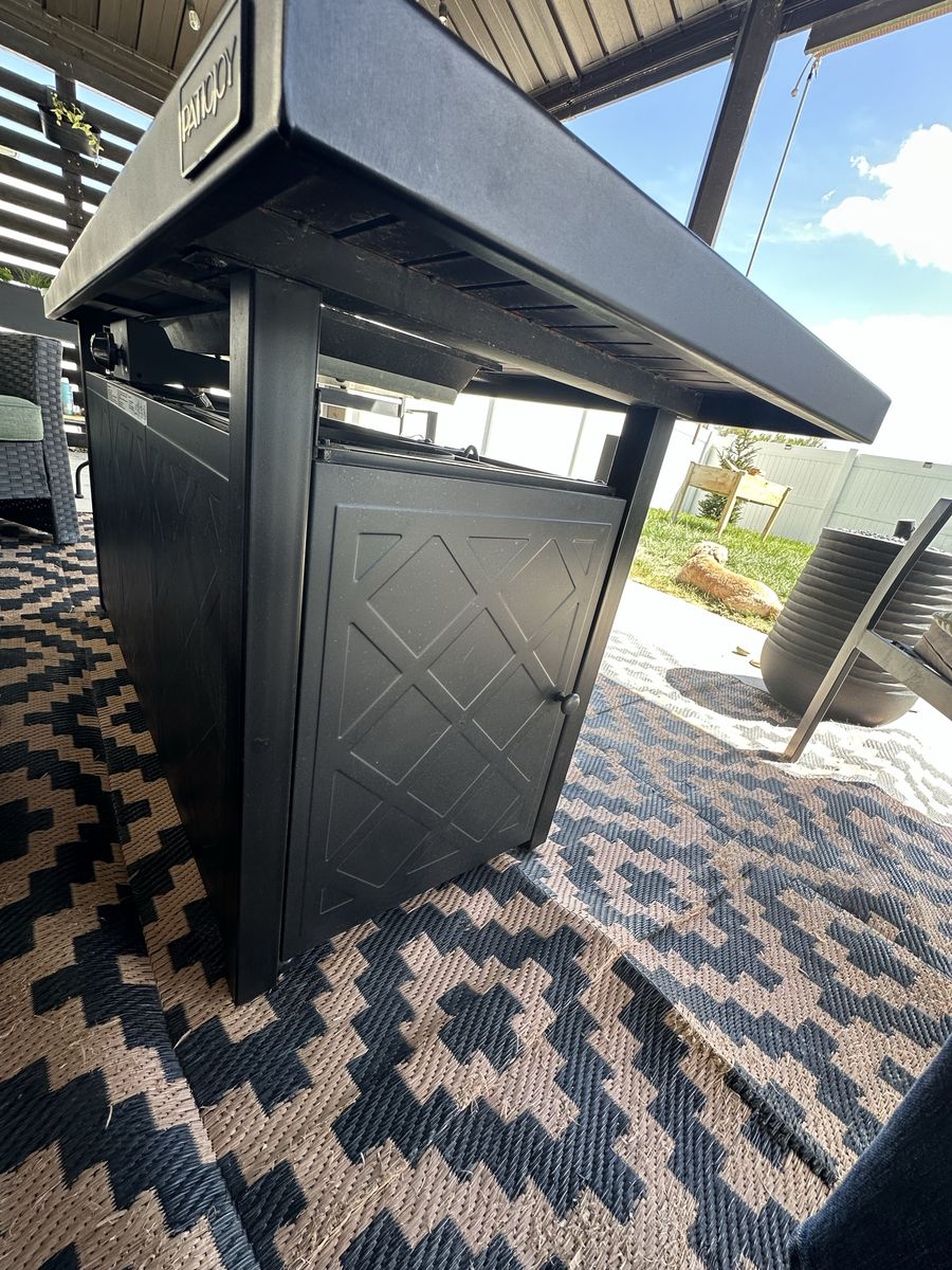 CashAppPATIOJOY Fire pit/table ran with propane. In good condition and kept under an awning entire time. Still gets dirty and wet at times but rarely. No problems with it, works as seen in pics. Door opens and latches shut with no problems. Could store items beneath behind propane tank if wanted. 2 people needed to lift and move.