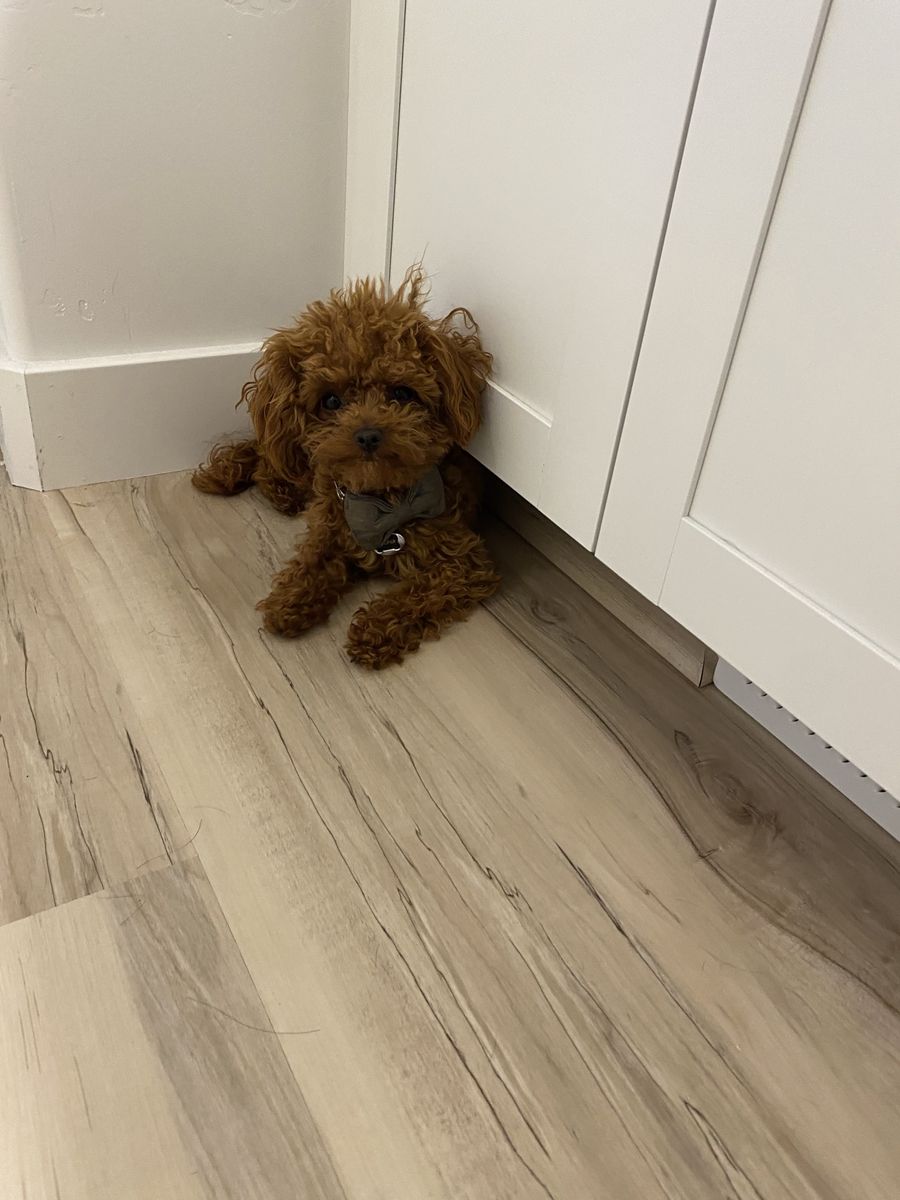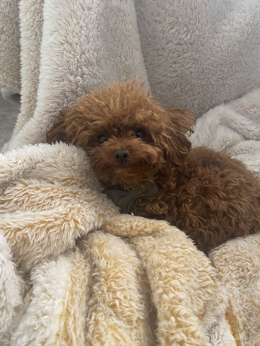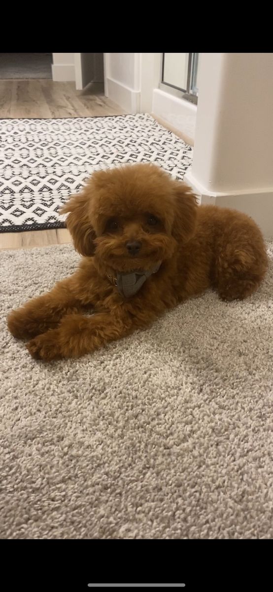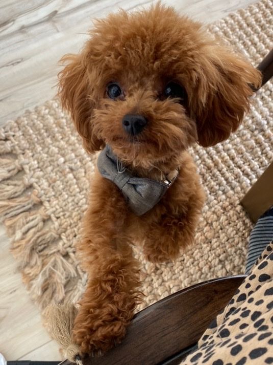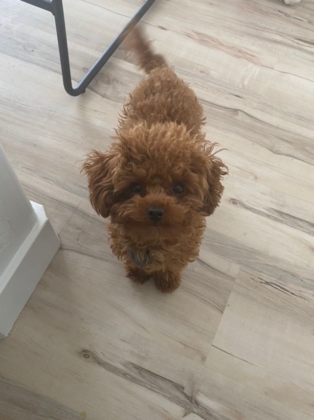 Cooper is the sweetest little guy. He weighs a tiny 3lbs and is a beautiful deep red! He comes from a long line of red toy poodles, but has the genes to create white patches in his litters! Every puppy born has a variety of white paws, chin, chest, and/or a cute white patch on their head! He has been DNA tested and is completely cleared and is not a carrier of any diseases.