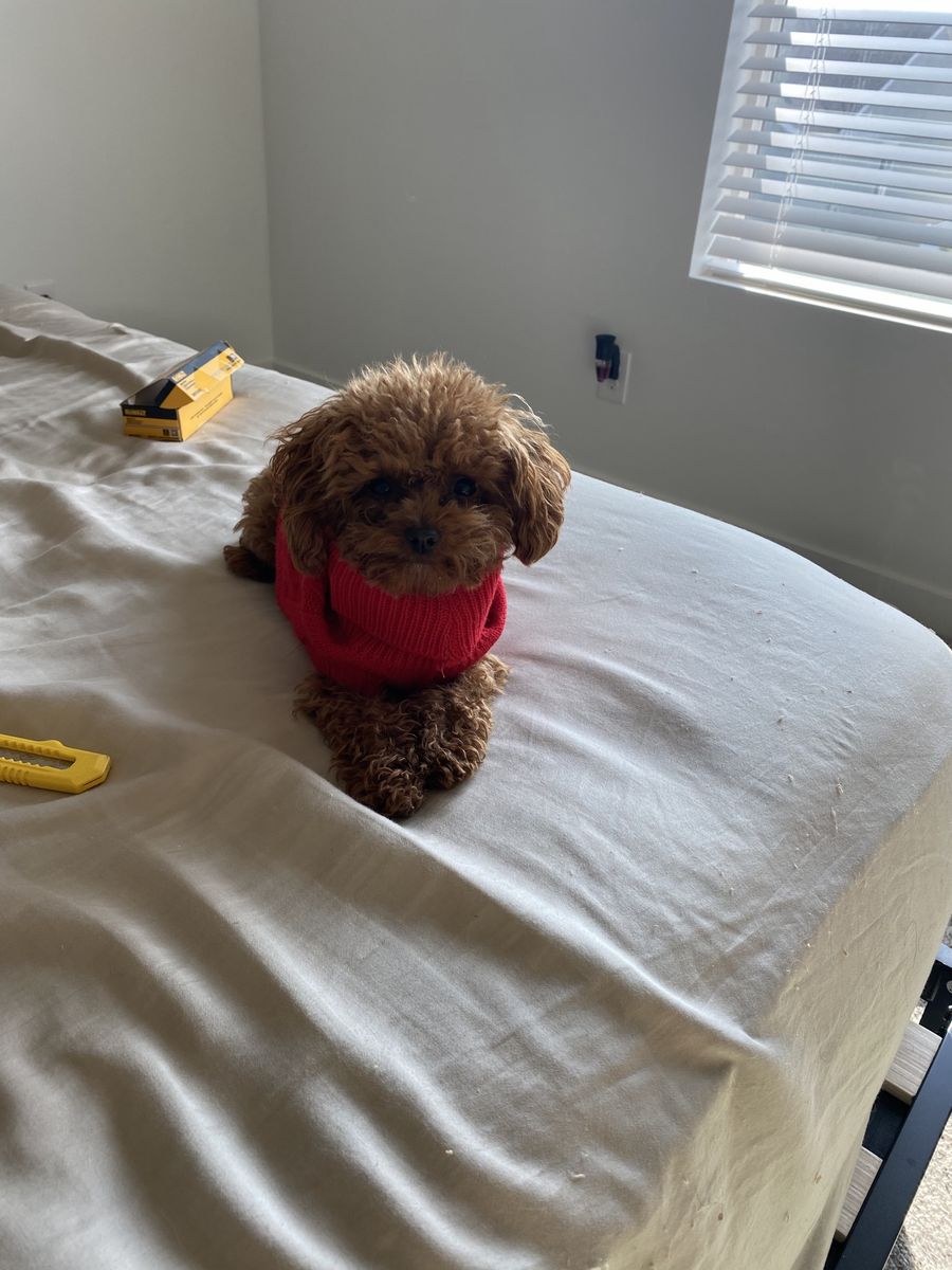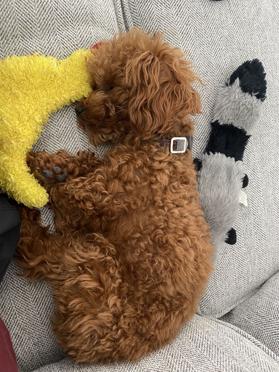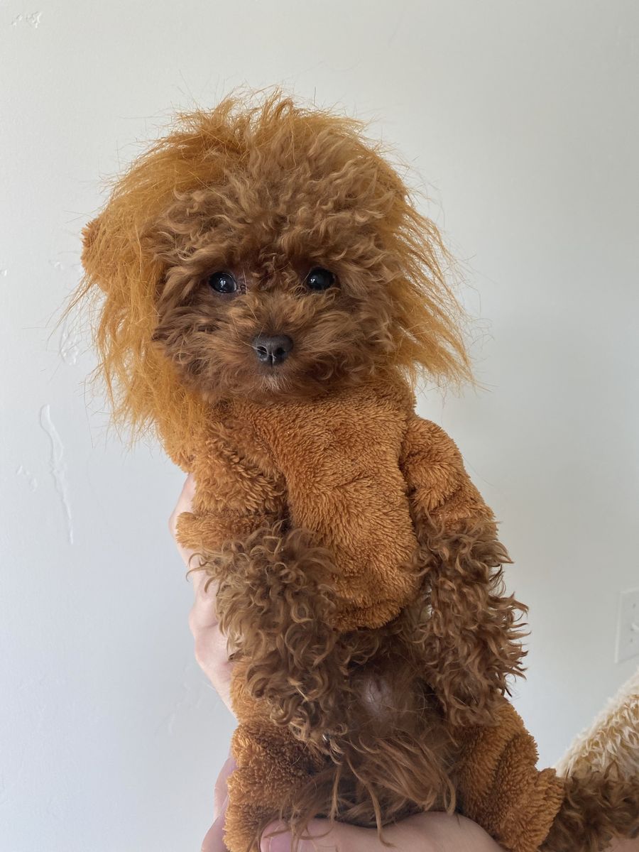 Cooper is the sweetest little guy. He weighs a tiny 3lbs and is a beautiful deep red! He comes from a long line of red toy poodles, but has the genes to create white patches in his litters! Every puppy born has a variety of white paws, chin, chest, and/or a cute white patch on their head! He has been DNA tested and is completely cleared and is not a carrier of any diseases.