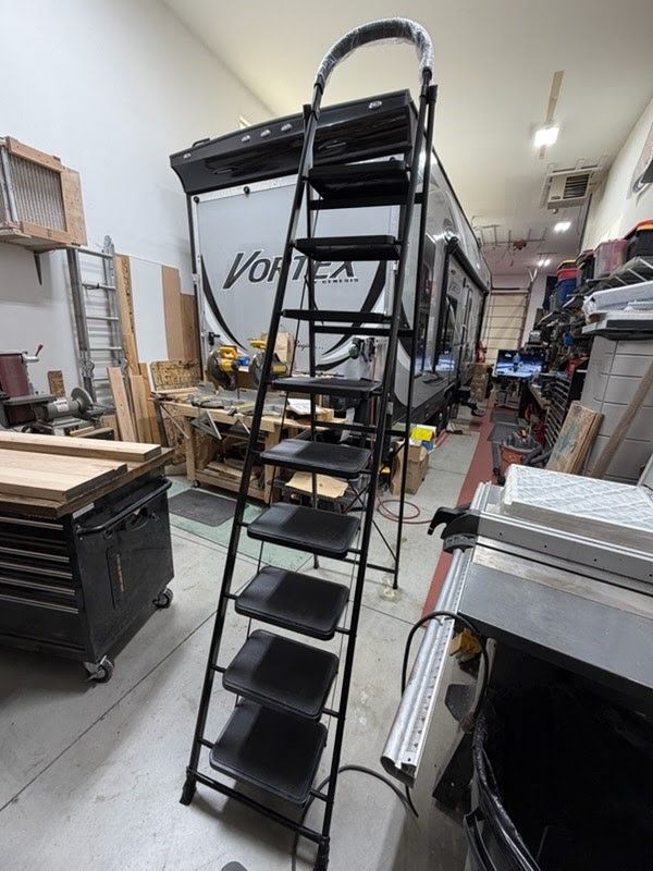 Venmo9ft step ladder. It has 9 steps and weighs 18lbs. Folds up flat for easy storage. Asking $200.