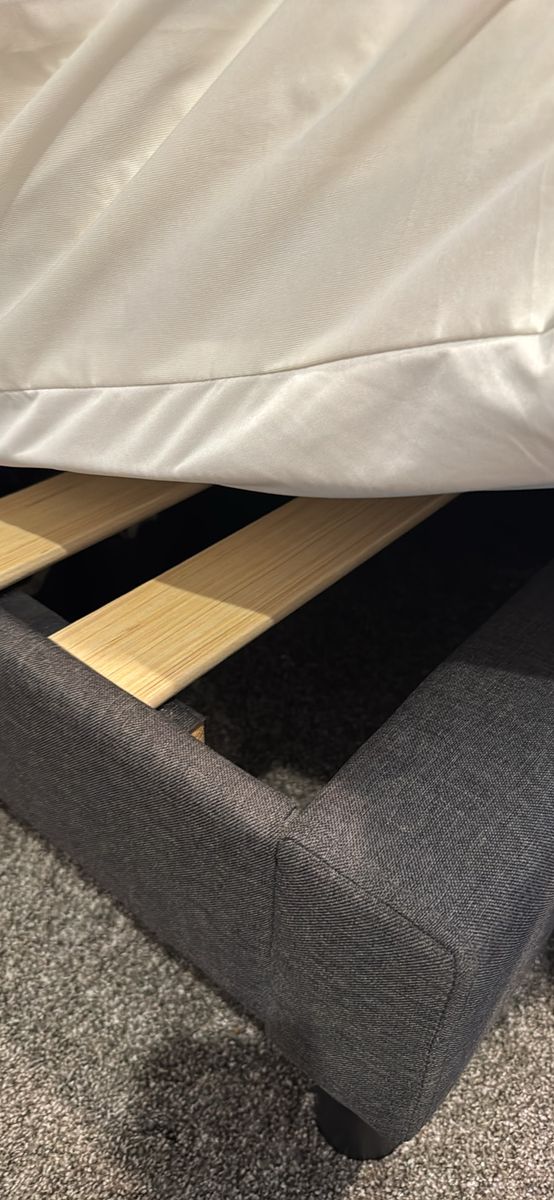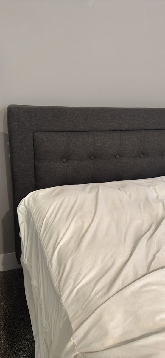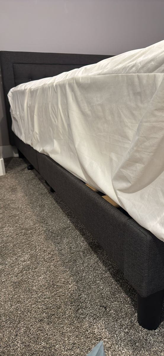 King side platform bed Dark grey upholstered tufted headboard In near new condition! No damage. Does not include mattress.