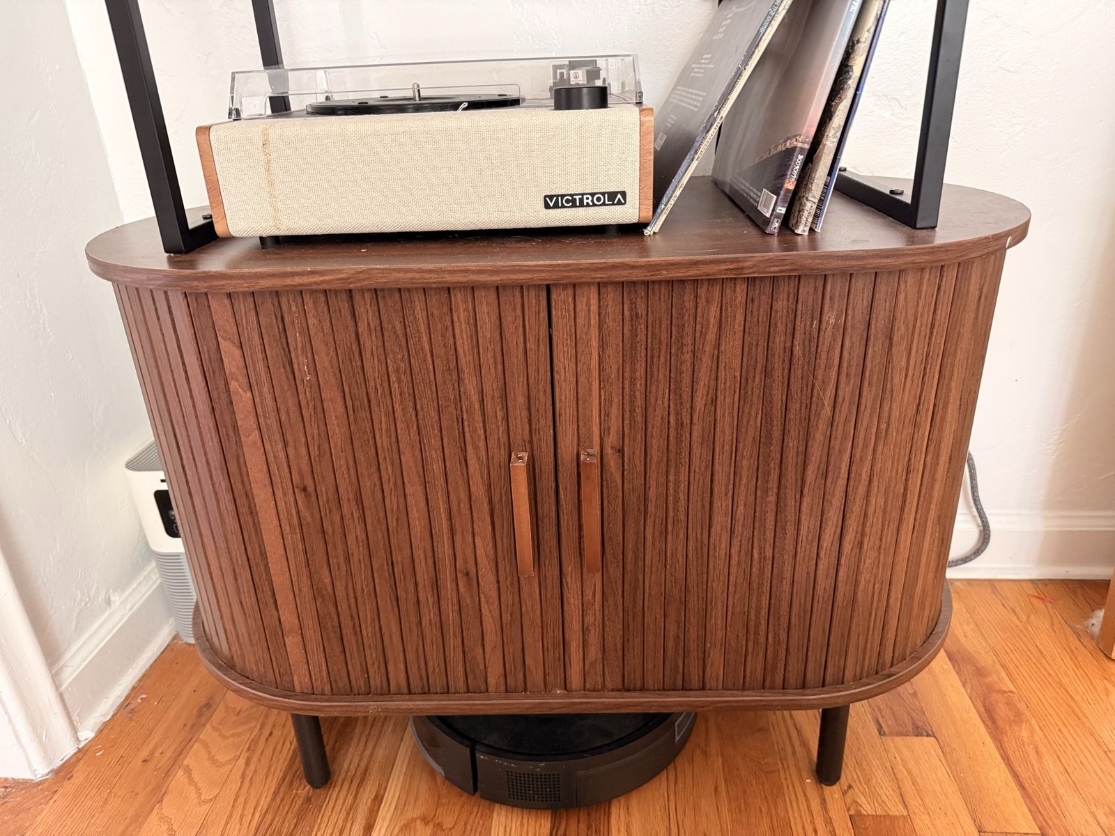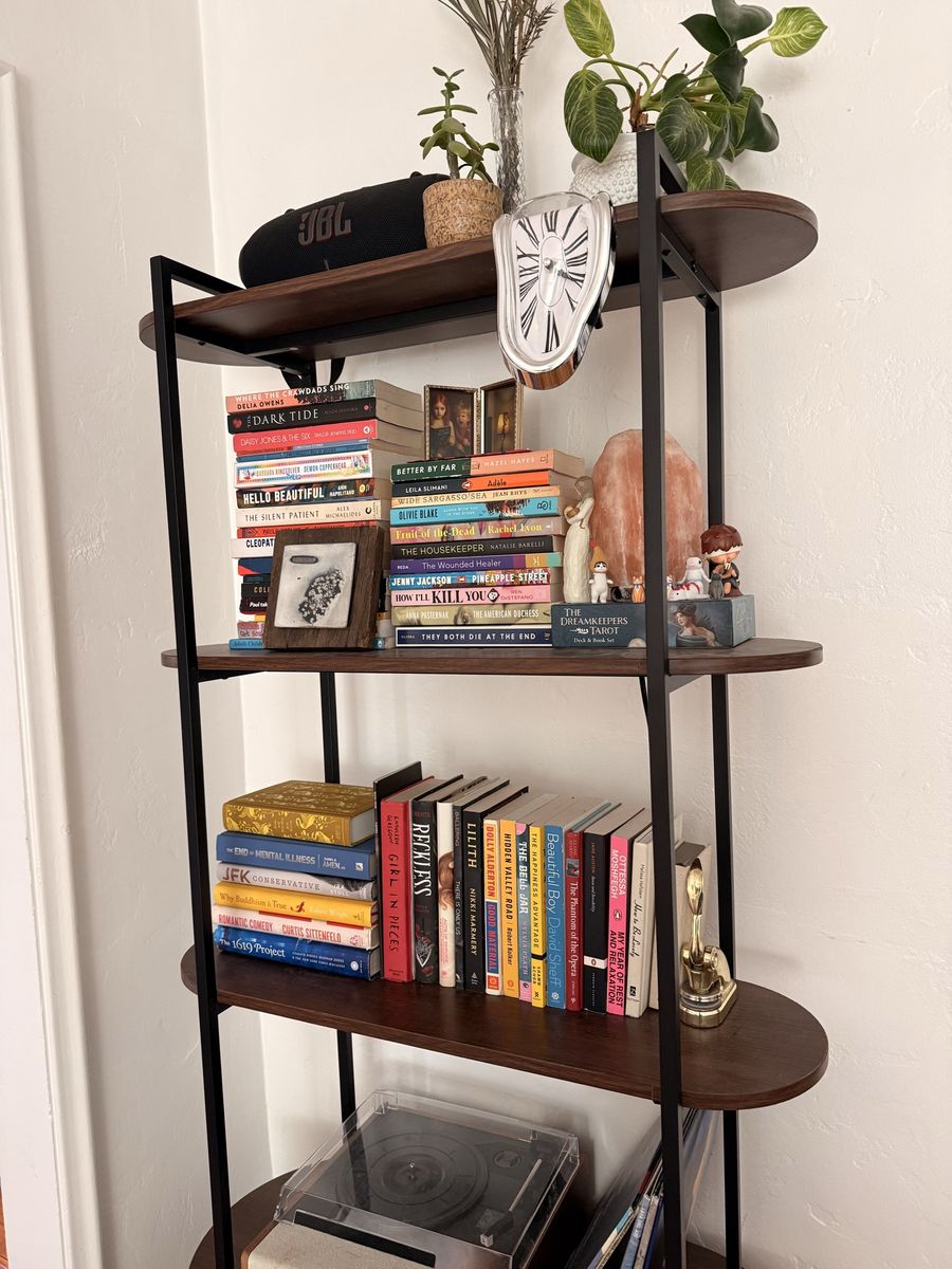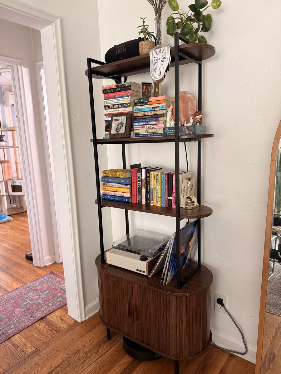 This modern bookshelf has been such a great stylish touch to my space. I’ve loved the storage and aesthetic it provides! The doors on the bottom are roll sliding doors, so they don’t swing out or take up extra space when opening. There’s only a few very small nicks in the wood, other than that it’s in great shape! Dm me with questions!