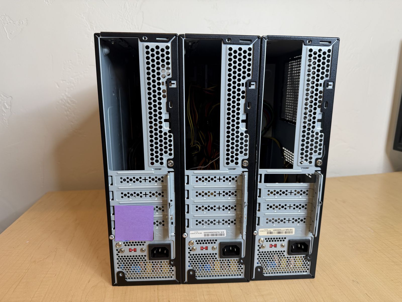 These are mostly empty cases that I removed the computer parts from. They have all of the cables and hookups and they have 300 Watt power supplies in them. Two of them have optical drives in them. If you want to put your computer in a smaller case this deal is for you. If you want to build a computer and you need a smaller case with a power supply this deal is for you. If you are looking for a small form factor power supply this deal is for you. These cases with power supplies are $10 EACH CASH ONLY.