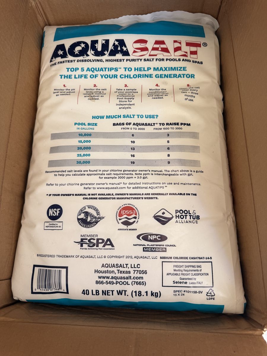 Stock up now for pool season! I no longer have a saltwater pool and have 13 unopened 40 lb bags of pool salt available.