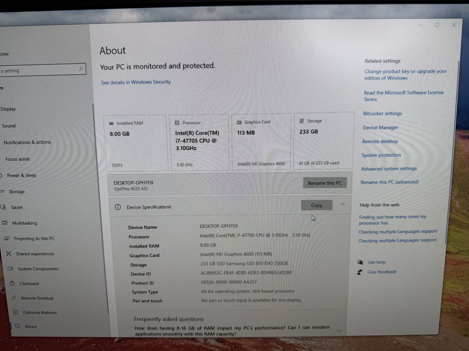 This is an old all in one desktop computer that I picked up from an auction. Windows 10 runs great, but it is not new enough to run Windows 11. Here are the specs: