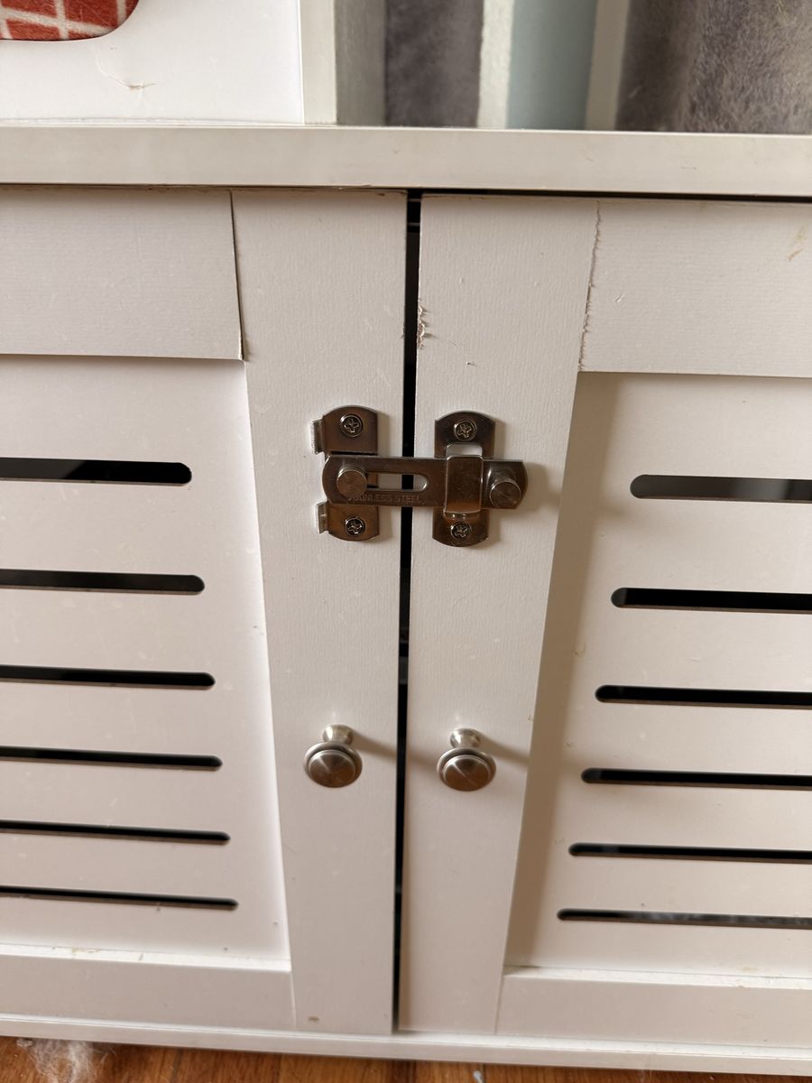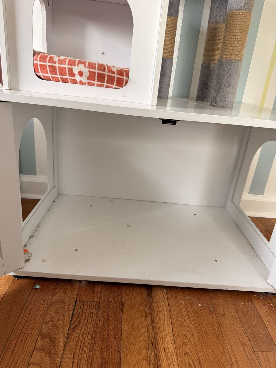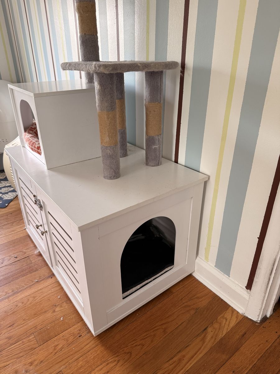Cute little cat tower/scratcher/storage cabinet! Was used to store cat supplies (food, toys, etc.) Was enjoyed by my cats but is still in great condition. I can’t take it where I’m going and need it gone!
