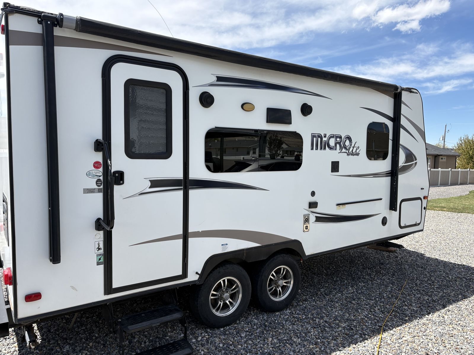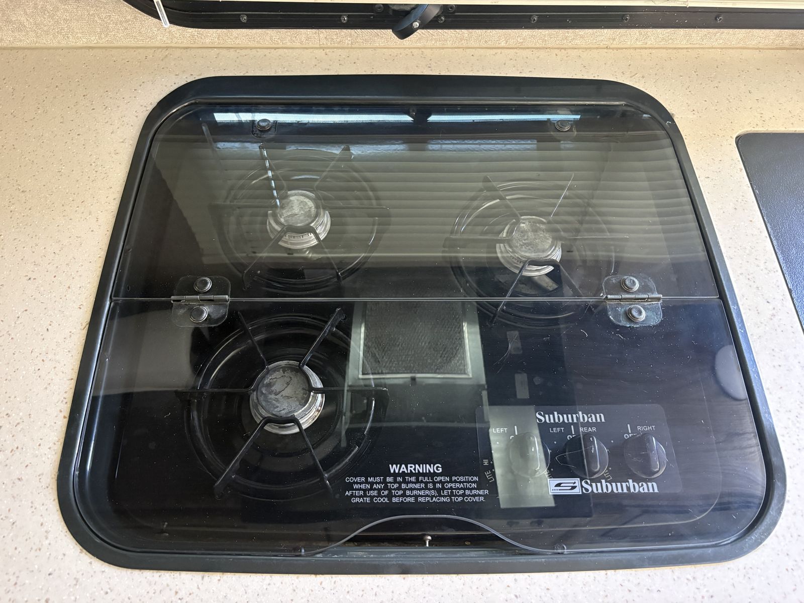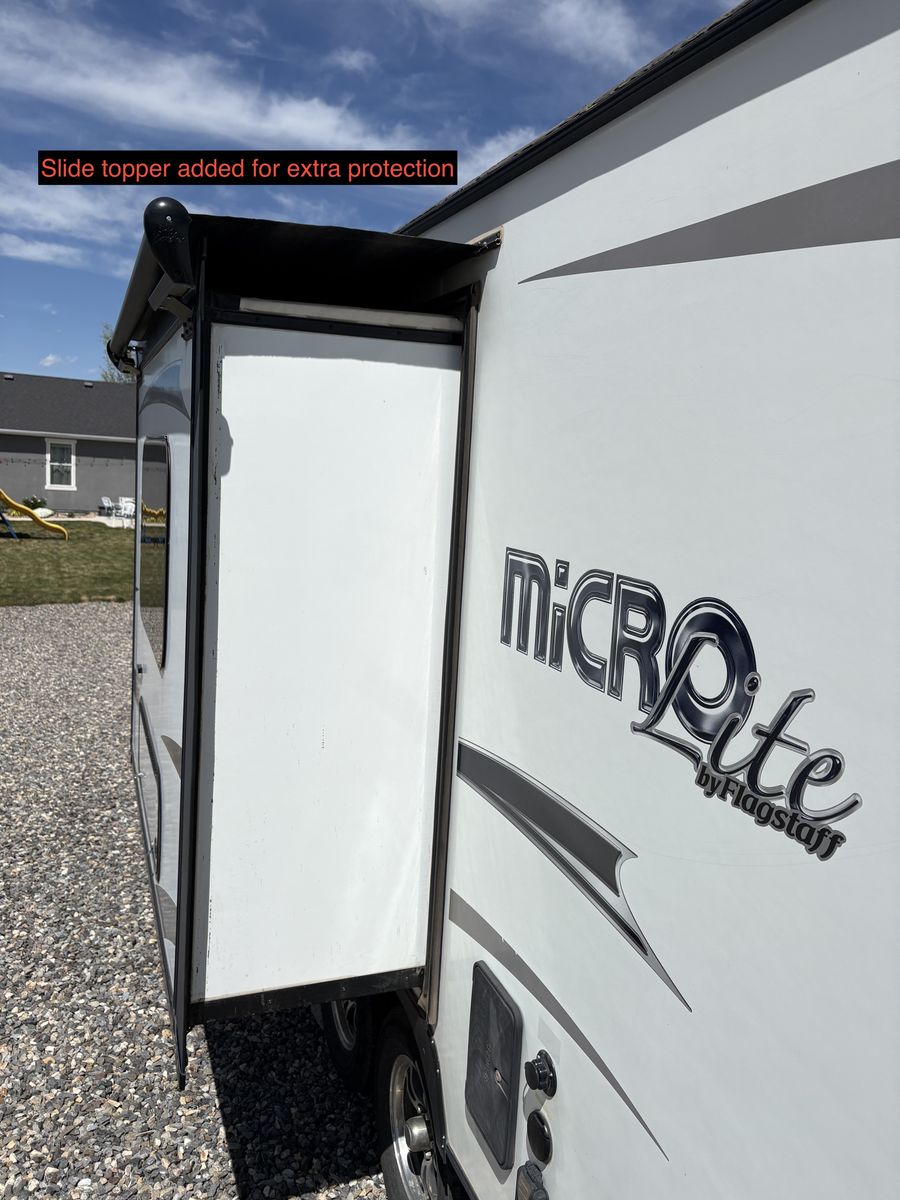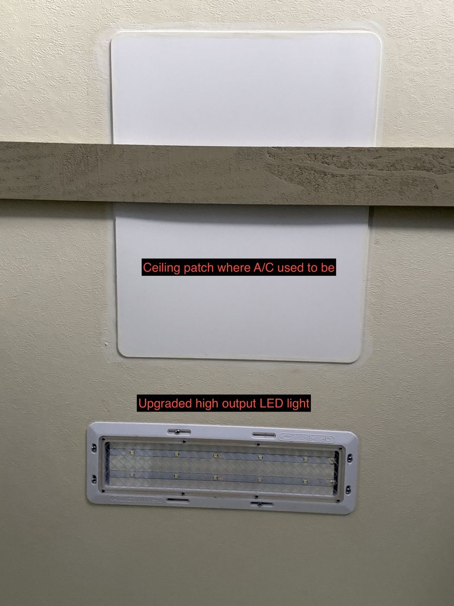 VenmoThis trailer has a salvage title. The previous owner drove under something too low and took the A/C off the roof. The roof has been repaired/patched but a new A/C unit was NOT installed. I put a powered fan over the bed and upgraded the power fan in the bathroom. With the fans and opening windows we have never wished we had A/C. This is a great trailer that tows well and is easy to get into smaller camp sites. All appliances work perfect. The awning was showing some weathering so I put a few rows of gorilla tape on the part of the awning that sits in the weather. Has two upgraded AGM 100 amp hour batteries.