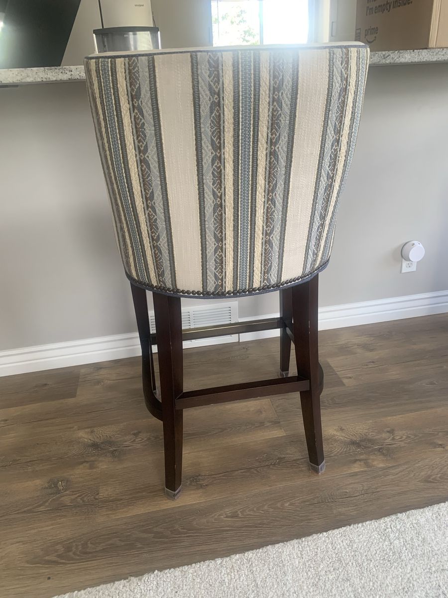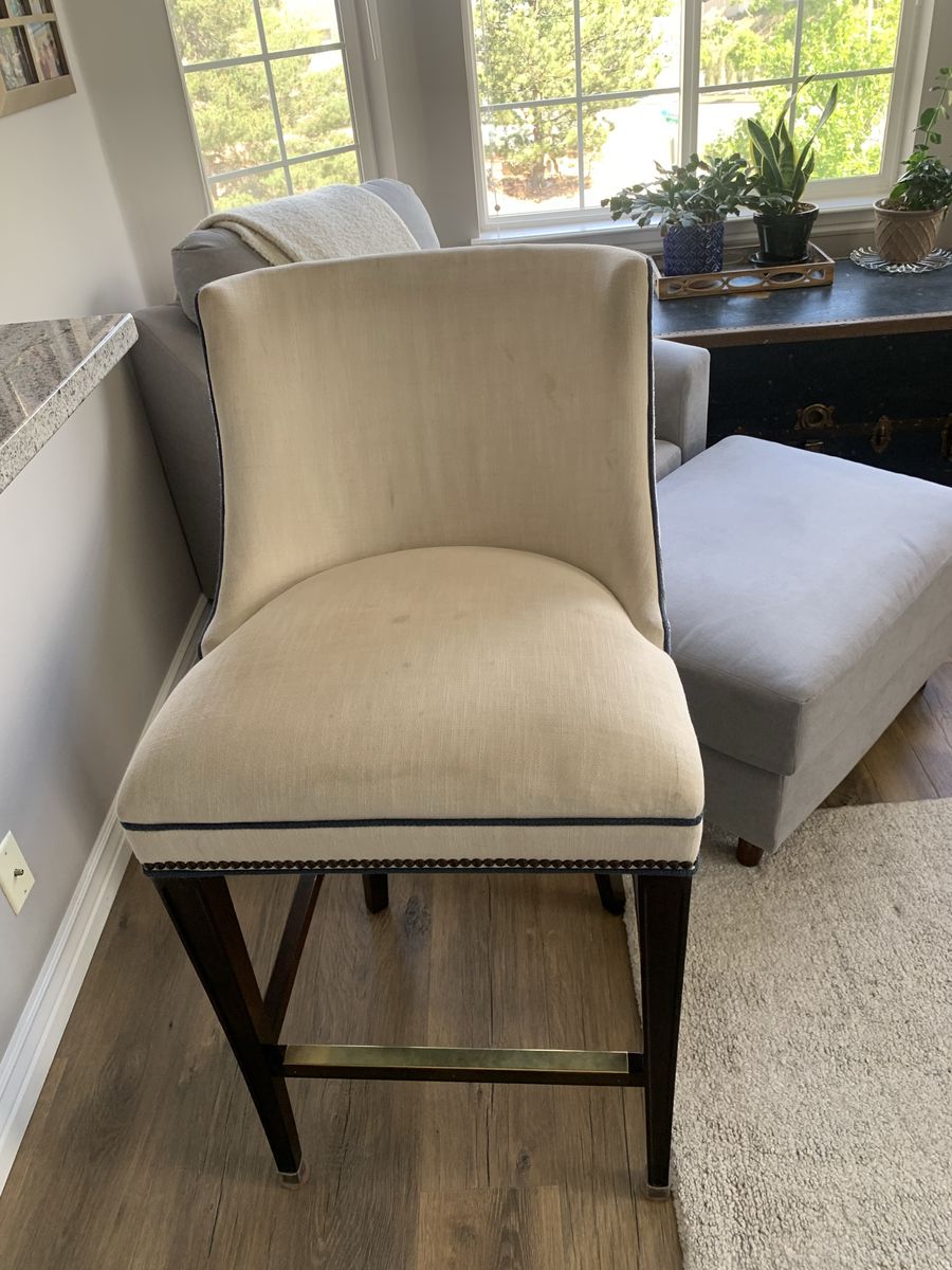ZelleSelling a set of three, handcrafted Wesley Hall counter height bar stools. High quality finishes including gold rail protectors. These came out of a remodel in Park City. The main seats have minor stains, but the fabric is in excellent condition. Moving and need to sell. $100 OBO