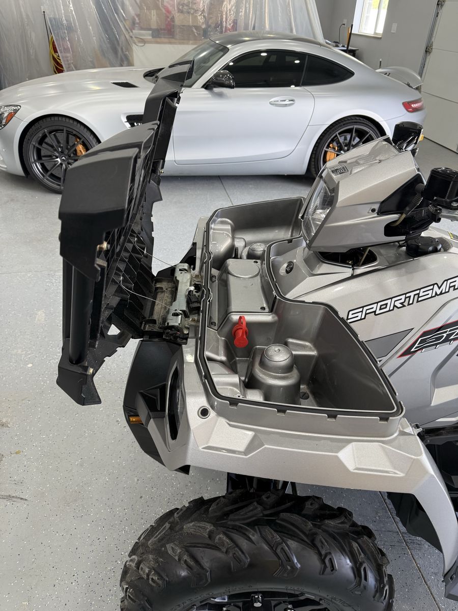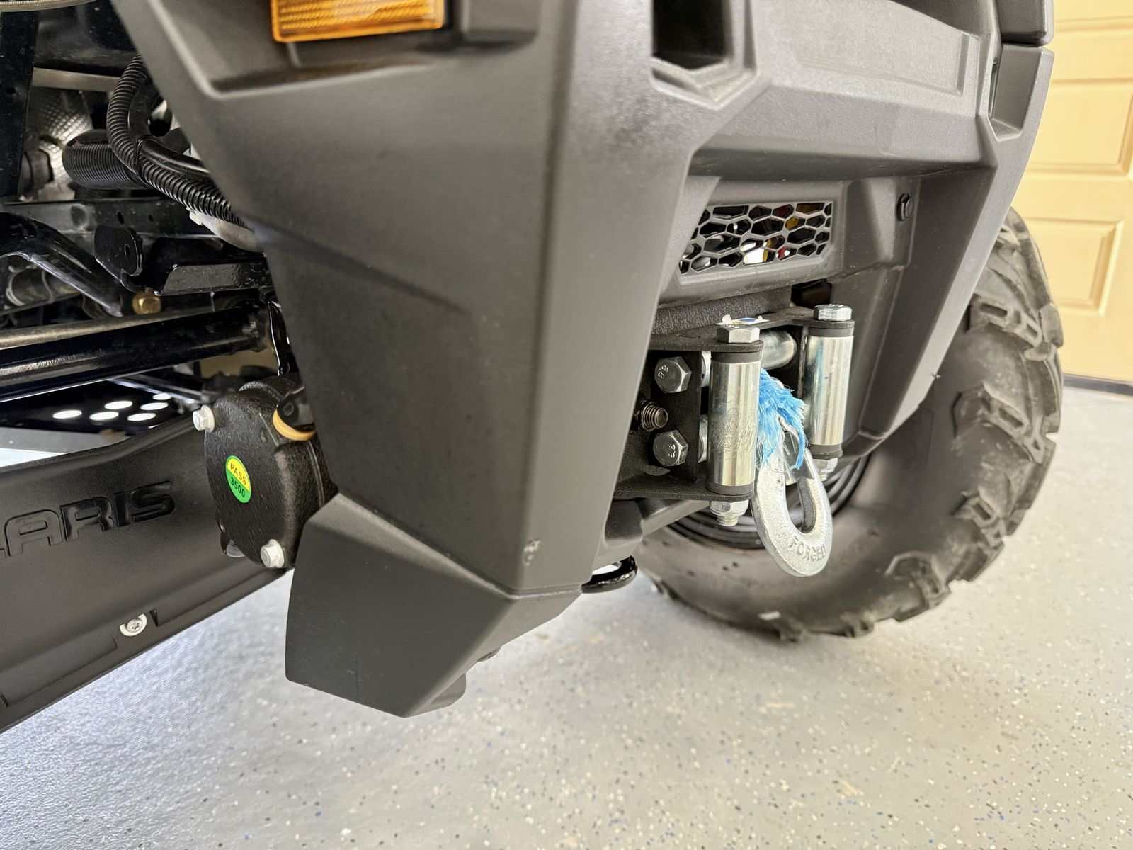 Polaris plow system with integrated mount makes it super easy to attach or remove the plow blade. It also has the Polaris factory winch system.