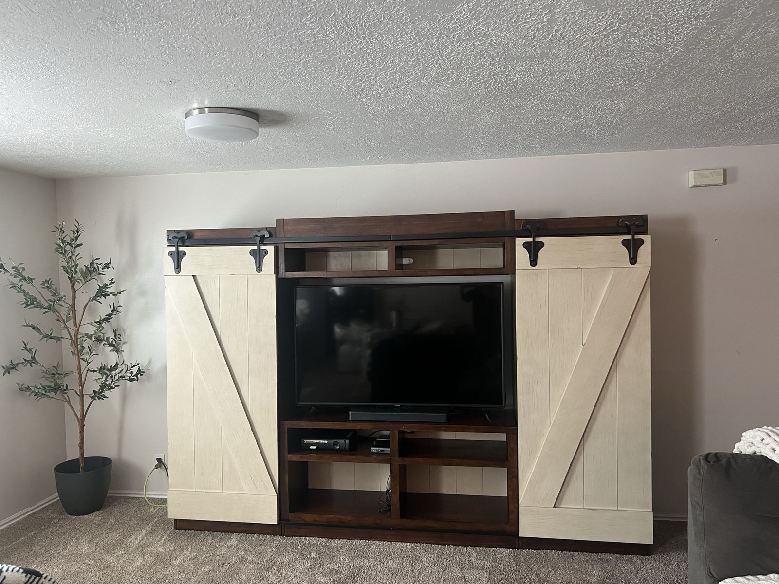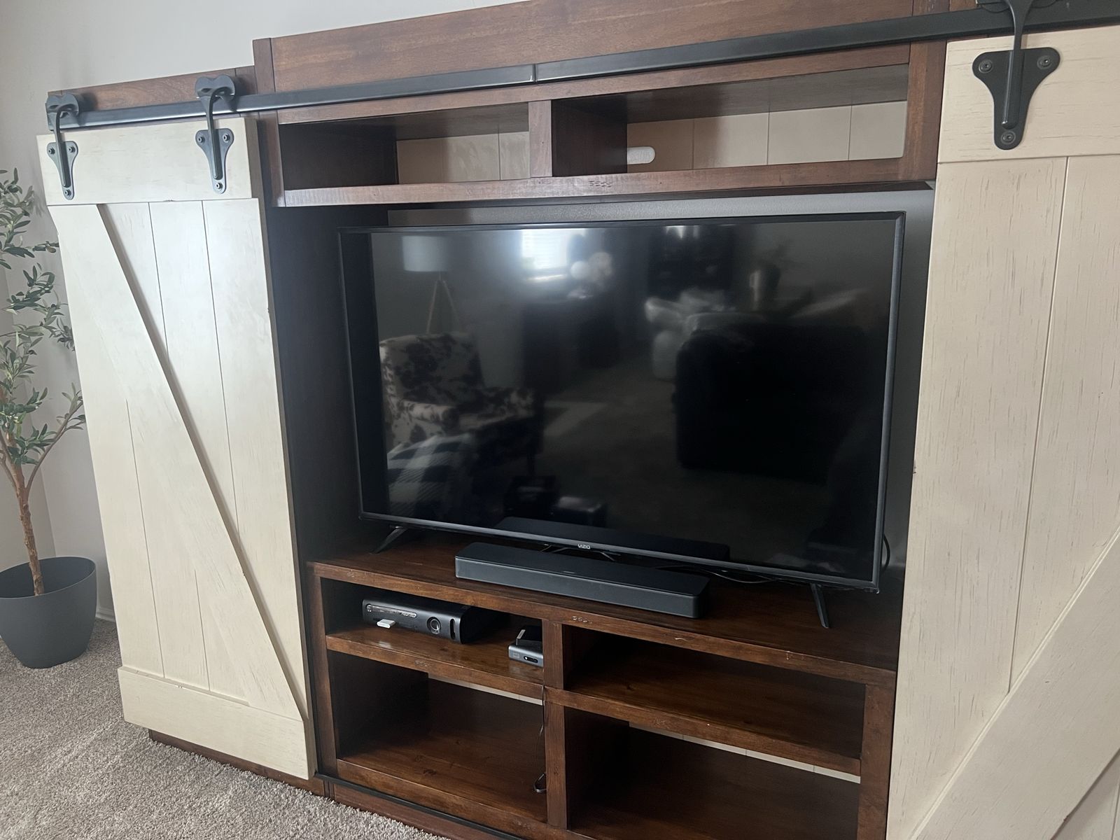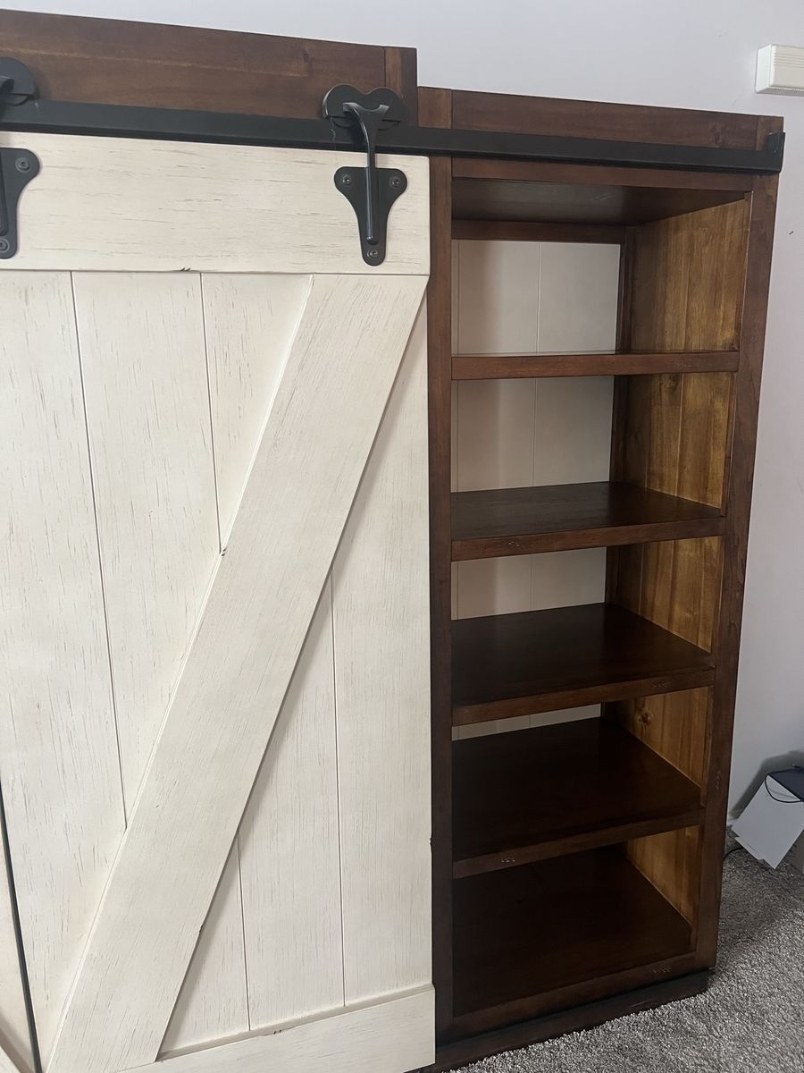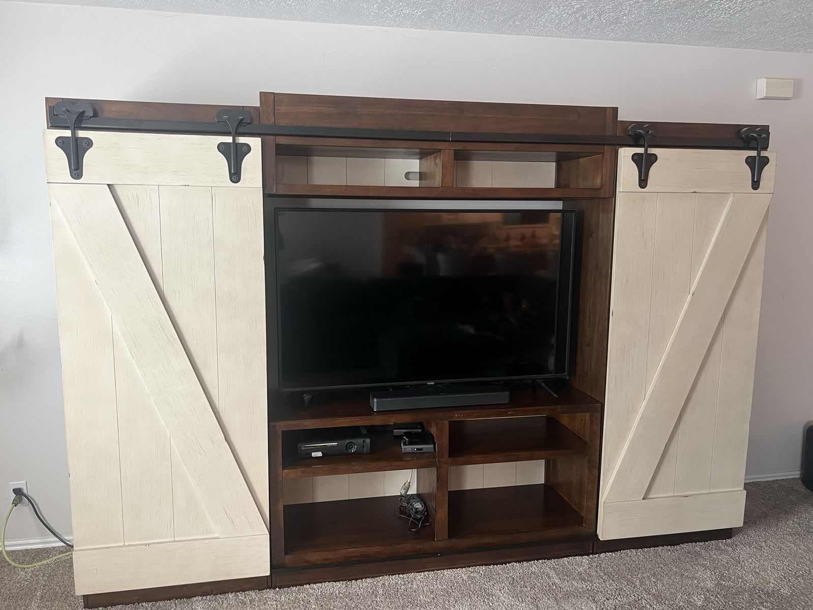 VenmoThis entertainment center features sliding barn doors with planked accents and open shelf design on the top of the pier units and console perfect for display or storage.