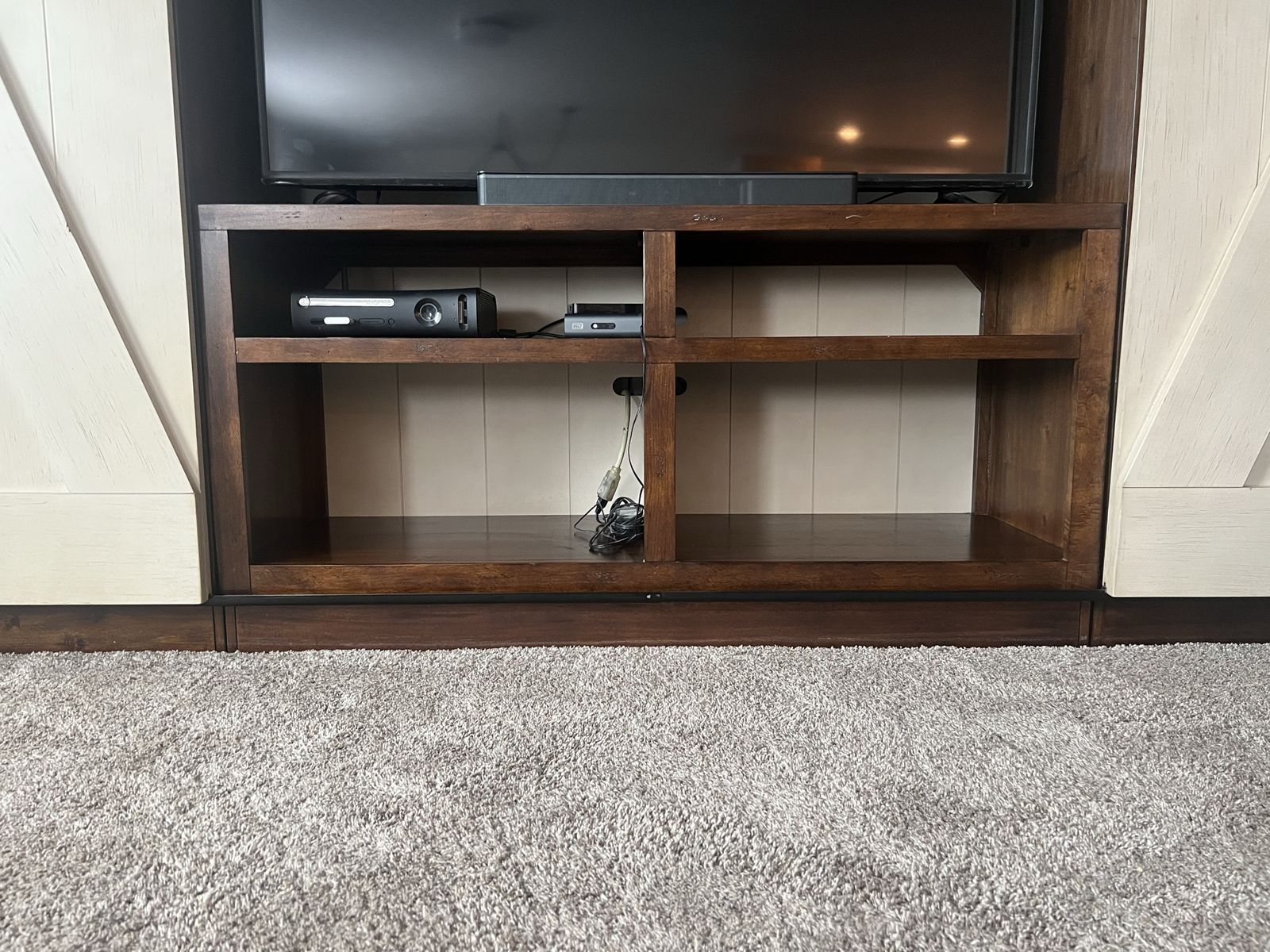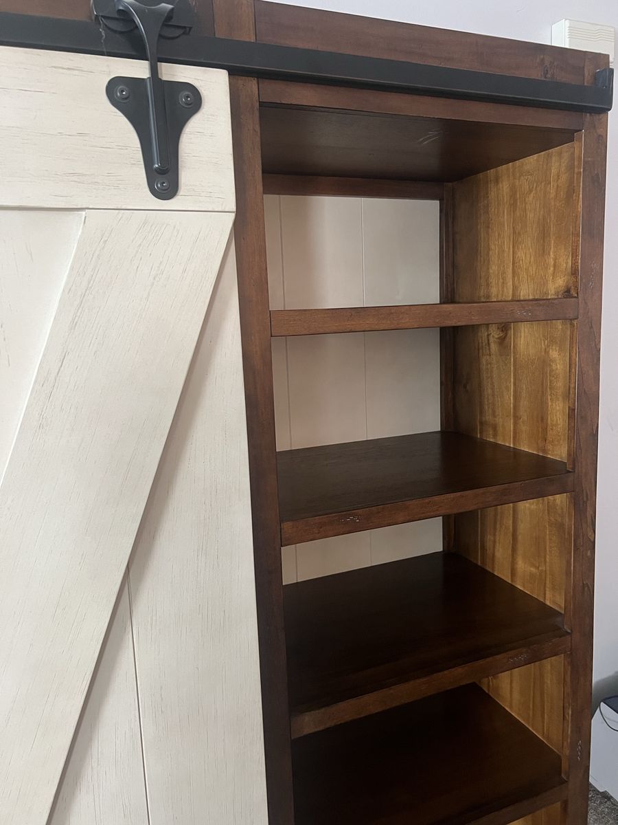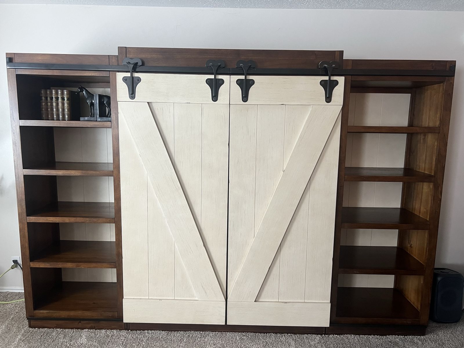 VenmoThis entertainment center features sliding barn doors with planked accents and open shelf design on the top of the pier units and console perfect for display or storage.