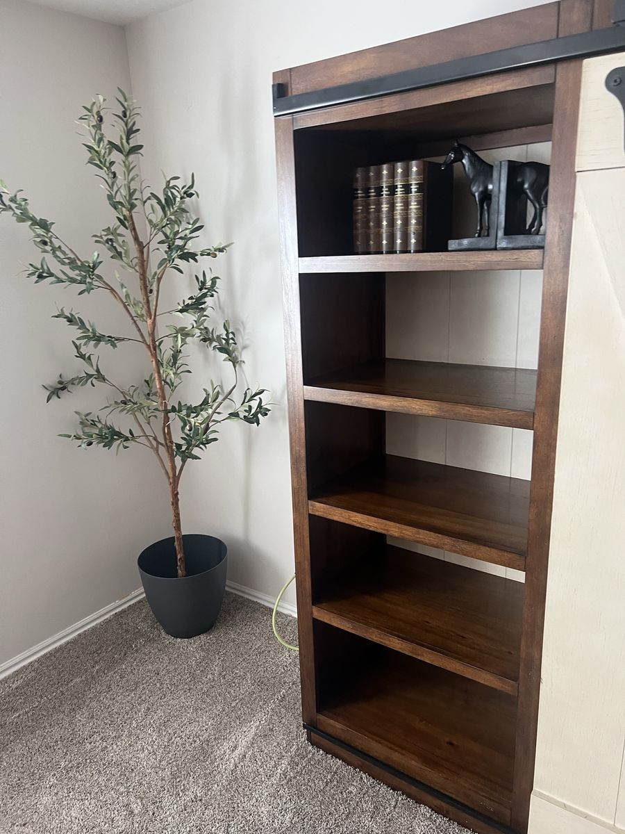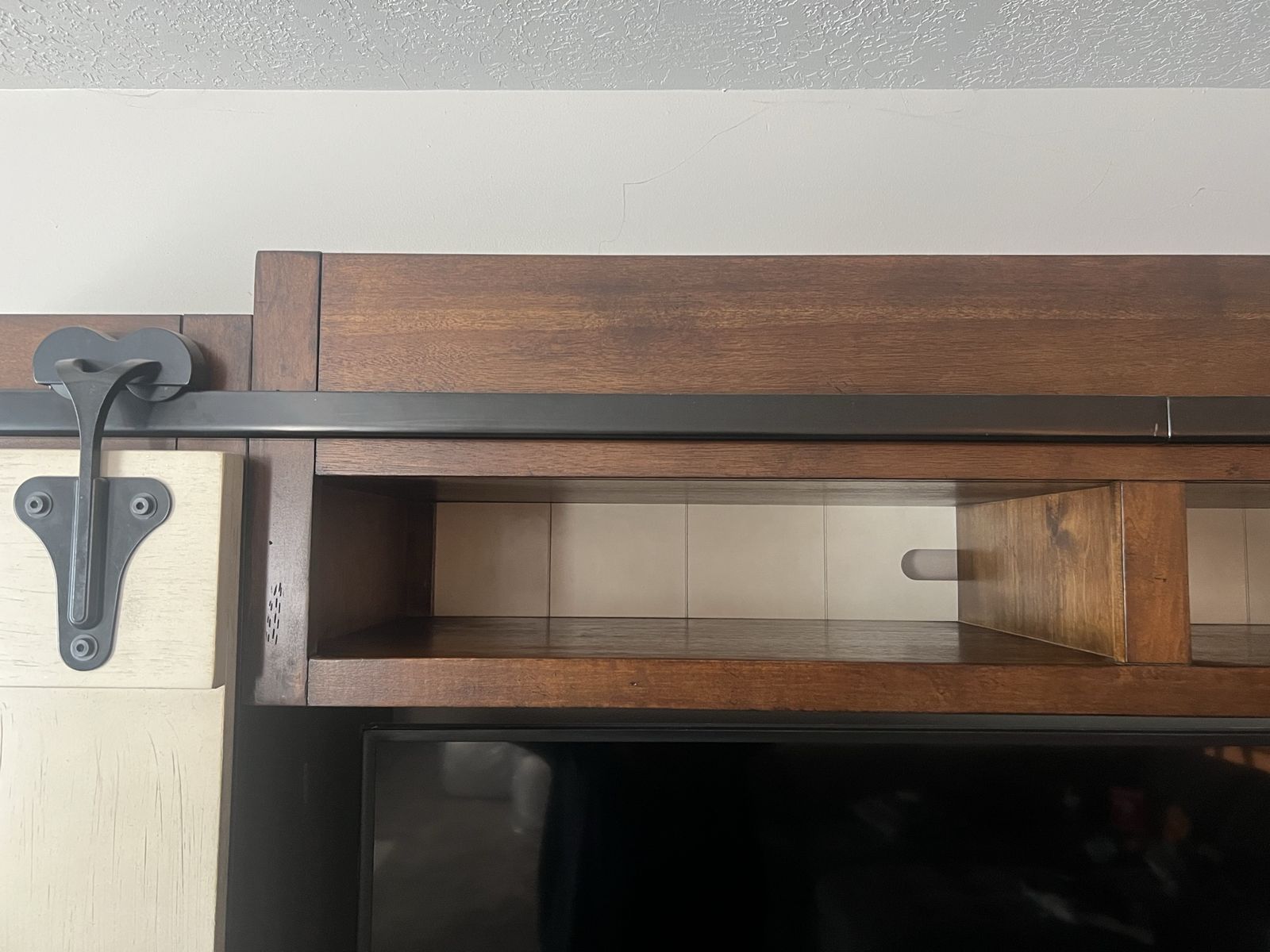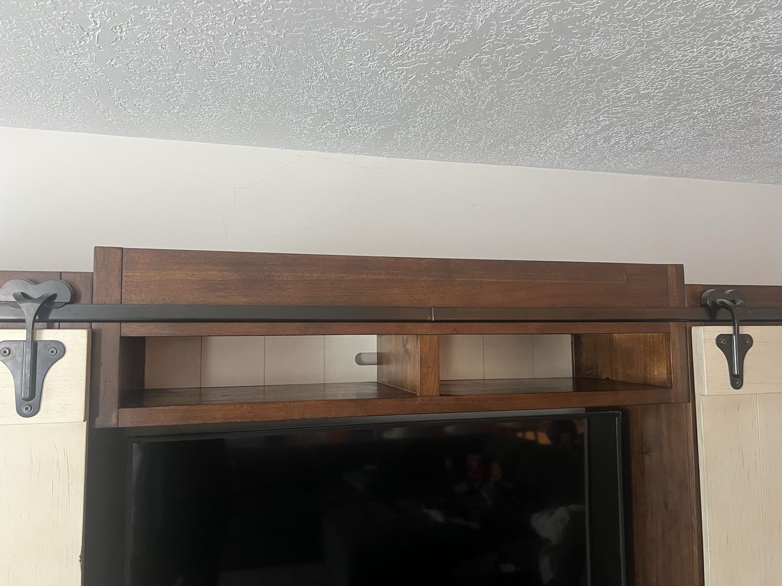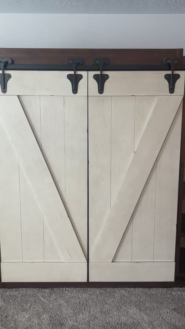 VenmoThis entertainment center features sliding barn doors with planked accents and open shelf design on the top of the pier units and console perfect for display or storage.