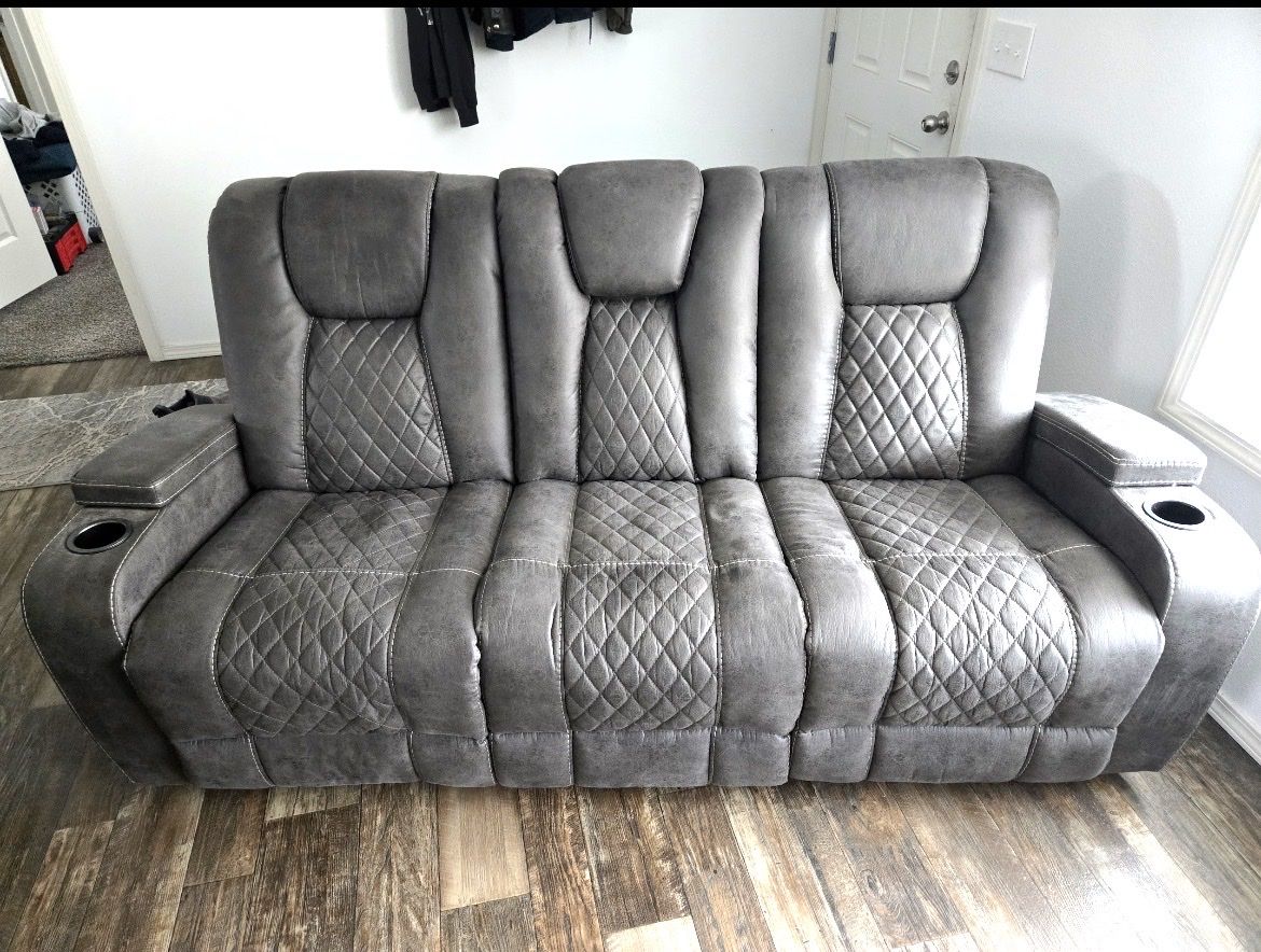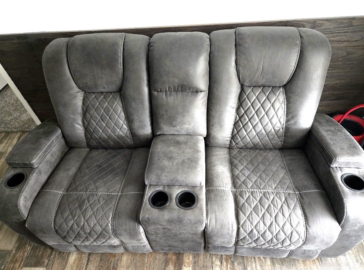 VenmoThis is a complete set. They’re in great shape and I’ve had them for about 3 years. There’s a standard manual recliner, loveseat with center console and rocking recliners, and a 3 seat sofa with a pull down center console and each end is a recliner. The material is faux leather. Price is negotiable
