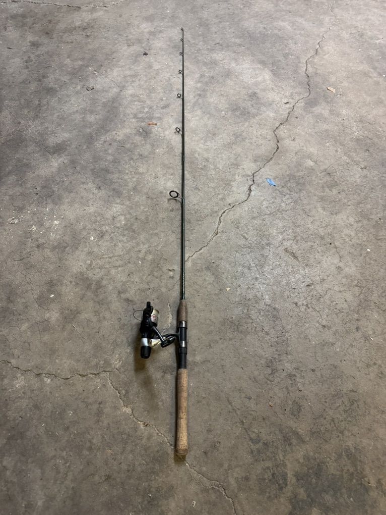 ApplePayShimano FX 2500RB reel and 6-1/2 ft quantum torsion IM6 rod. Great combination that works well. The reel uses a finger trigger to open the bail and a rear drag that are no longer featured on modern reels. The manufacture’s save a nickel by eliminating those features. The reel is missing the top button on the spool that releases it but it is still functional.