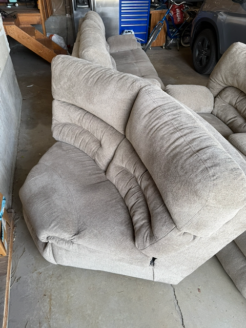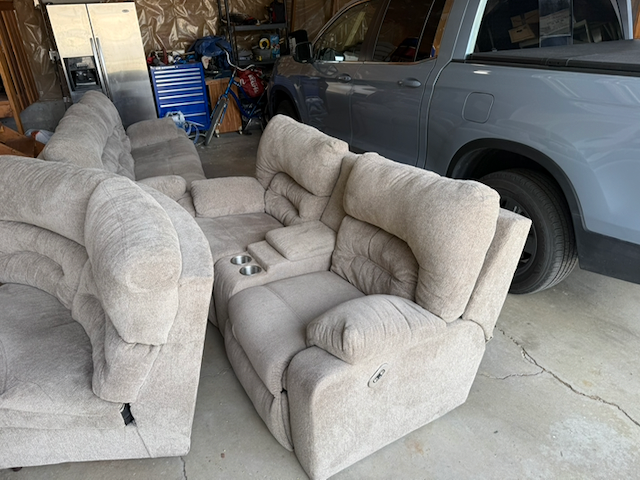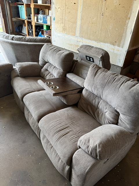ApplePayGreat sectional sofa. Clean and in decent condition. Consists of one sofa section with two motorized recliners and a fold out cupholder and light, one section with two motorized recliners plus cupholders and storage, and one corner section to connect the set.