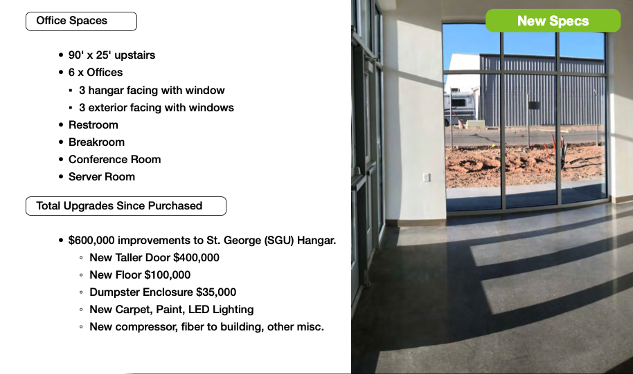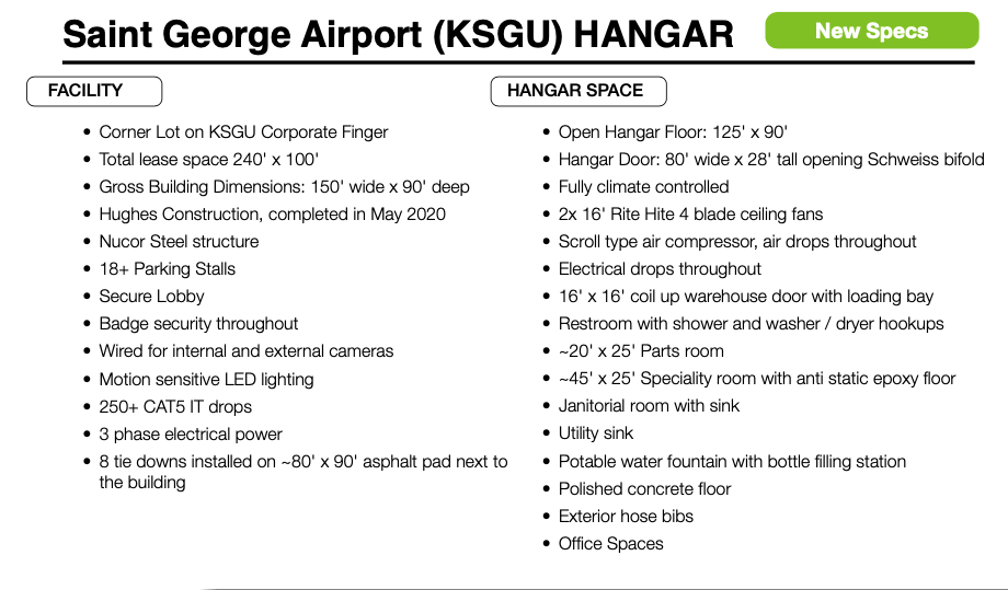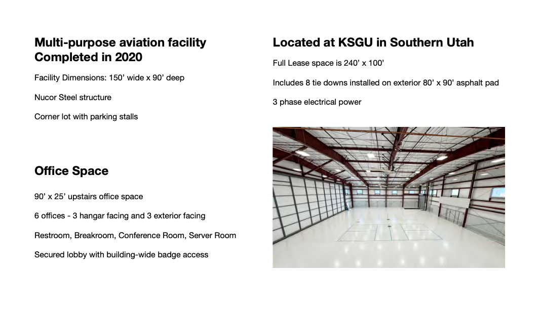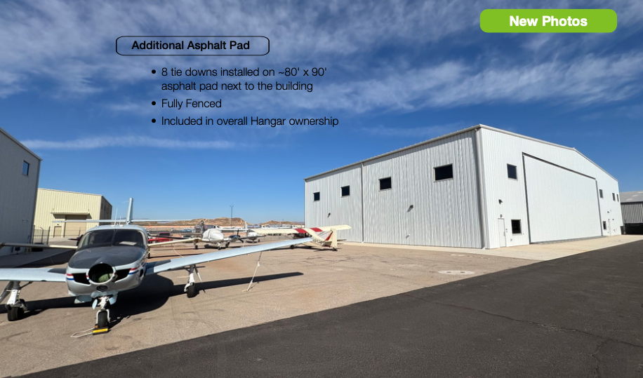 One of the only private jet capable hangars at SGU. Owned only 14 months.