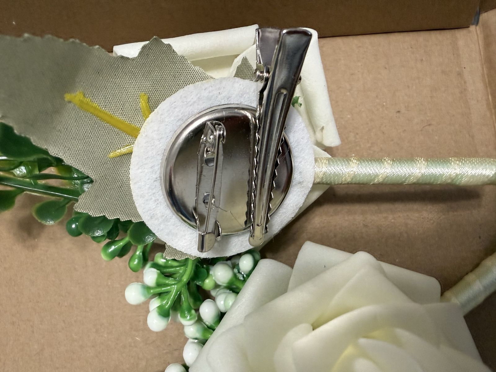 Venmo12 fake men’s white and green boutonnières with pin and clip backs.