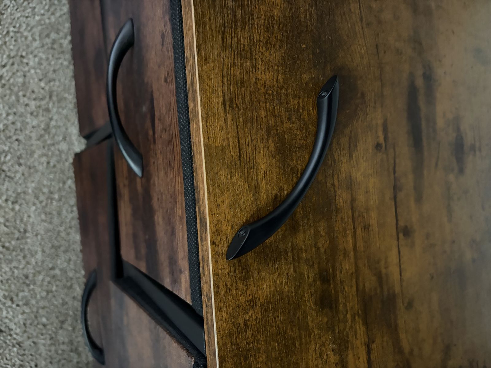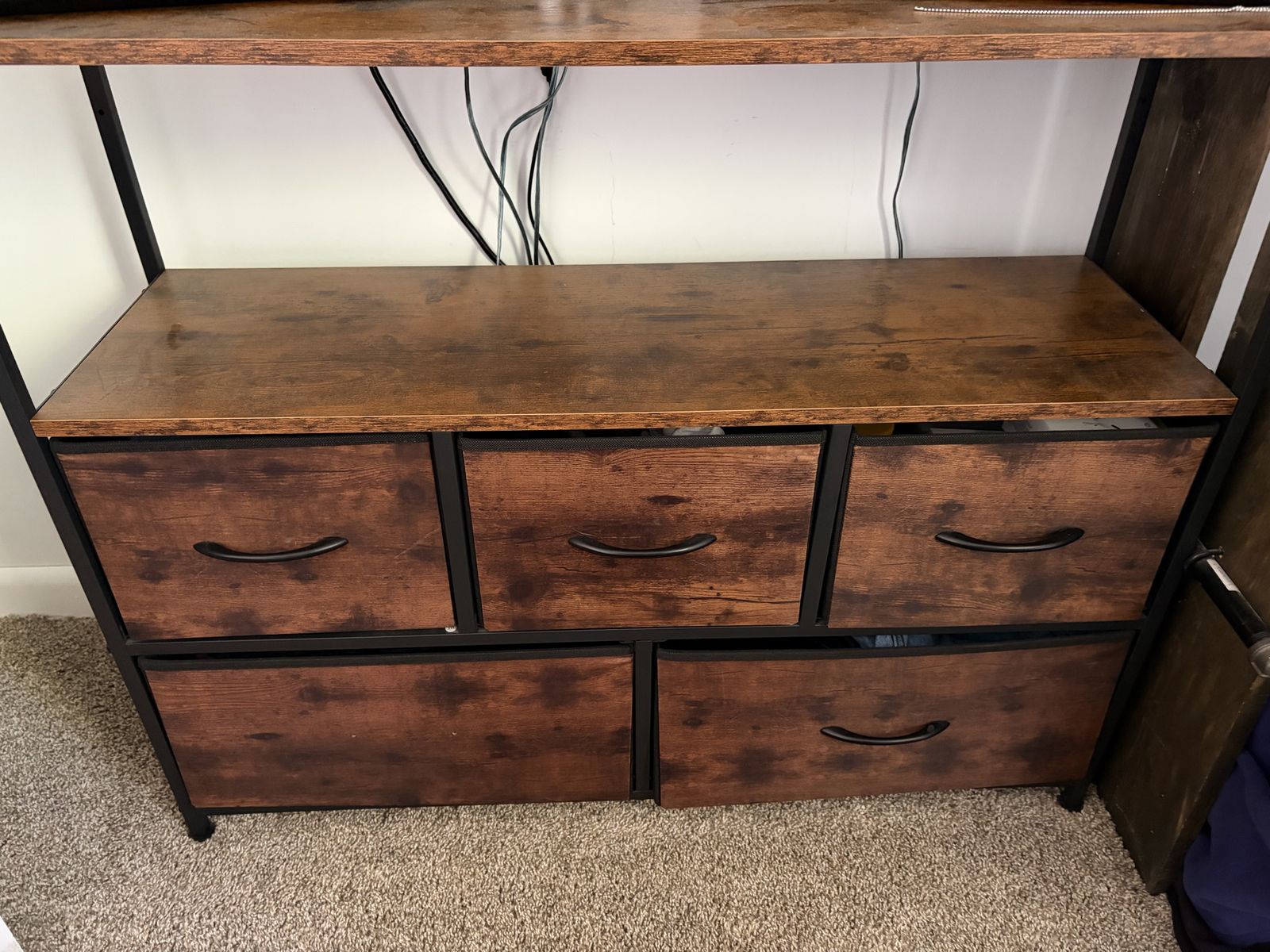 ApplePayRustic Brown wood grain print TV stand Dresser with 5 storage drawers. One of the handles just needs to be screwed back on. No scratches or dings or rips.