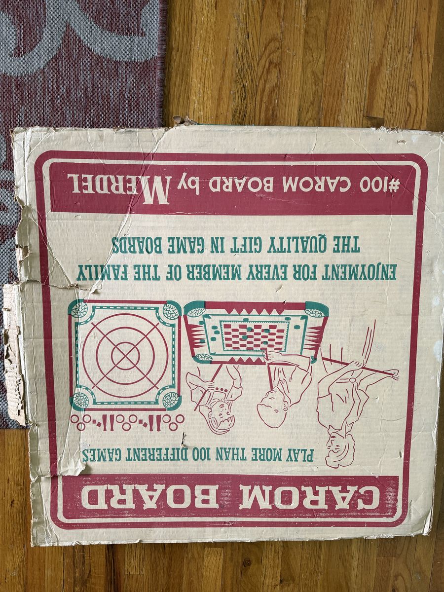 Vintage Merdel “#100 Carom Board” multi-game set from the mid-century era. This is a classic family game board featuring carom, checkers, and other tabletop games — great for both play and display.