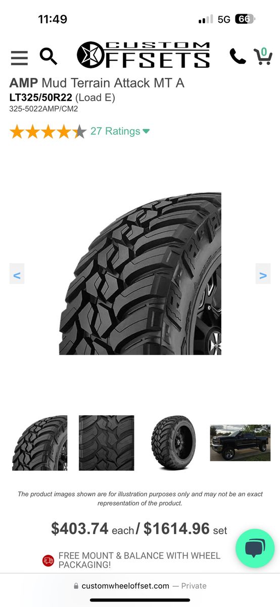 VenmoSelling a set of amp mts size 325/50r22(35x13). About a year old, 2 tires are 17/32 other 2 are 18/32 new they come around 19/32. One tire is patched from a nail when they were newer. Never gave me any issues. Text is best. 385-228-0121 $1000 firm