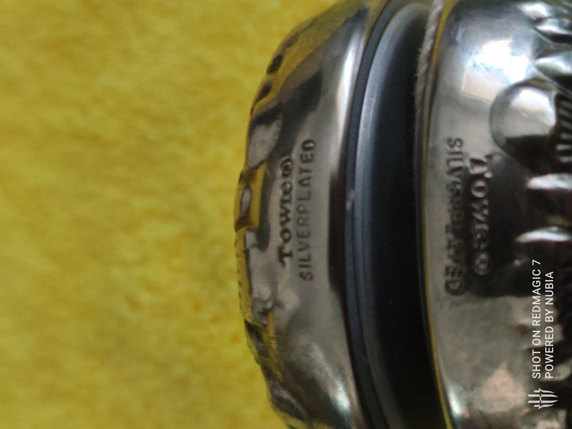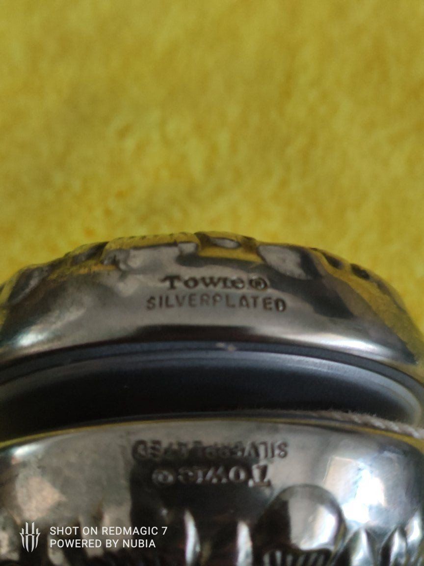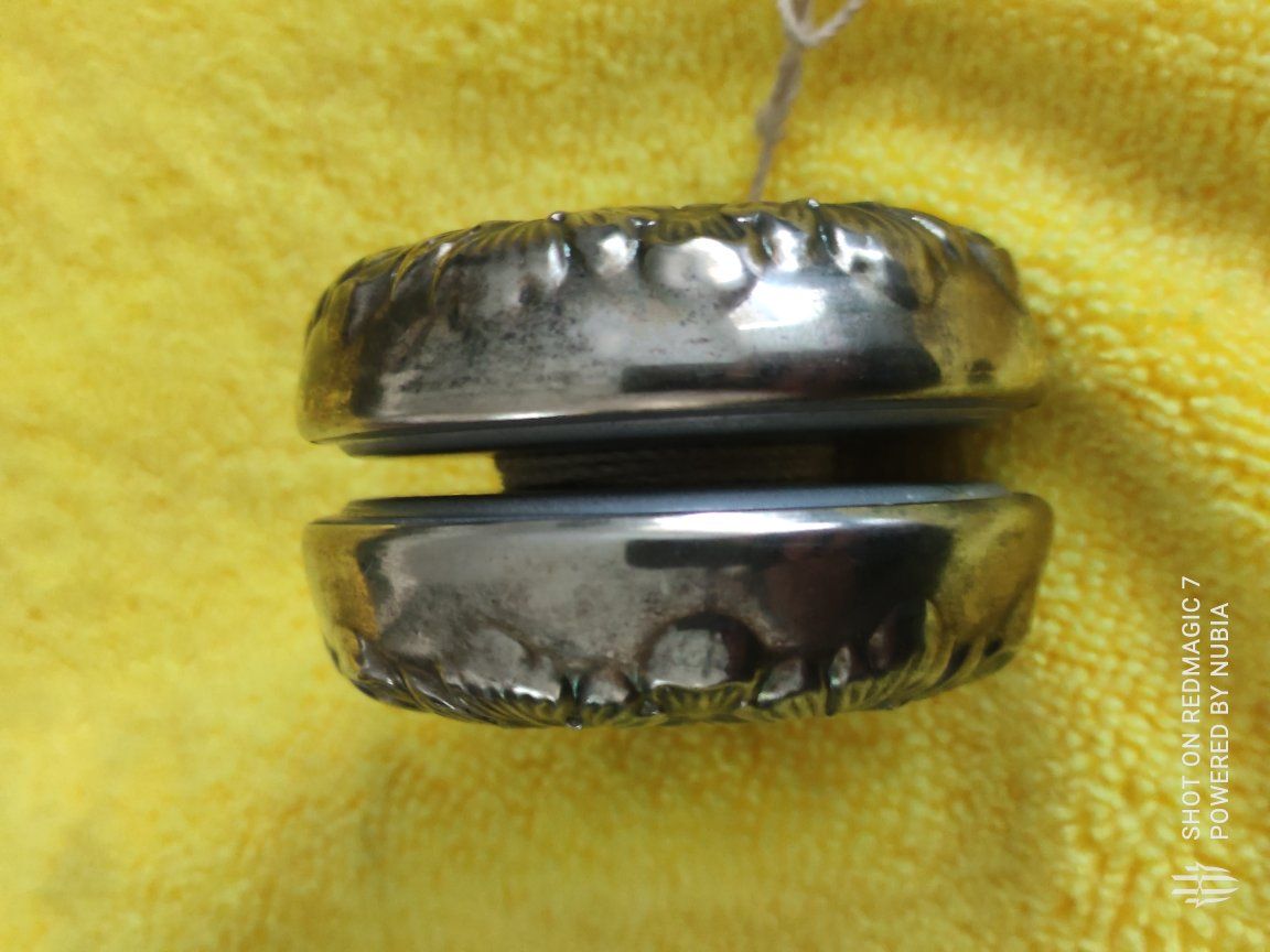 vintage Towle silverplate yoyo in mint condition and shape . 1970s era yoyo that measures 2.25 inches in diameter and is heavily embellish. it has some patina and color variance.